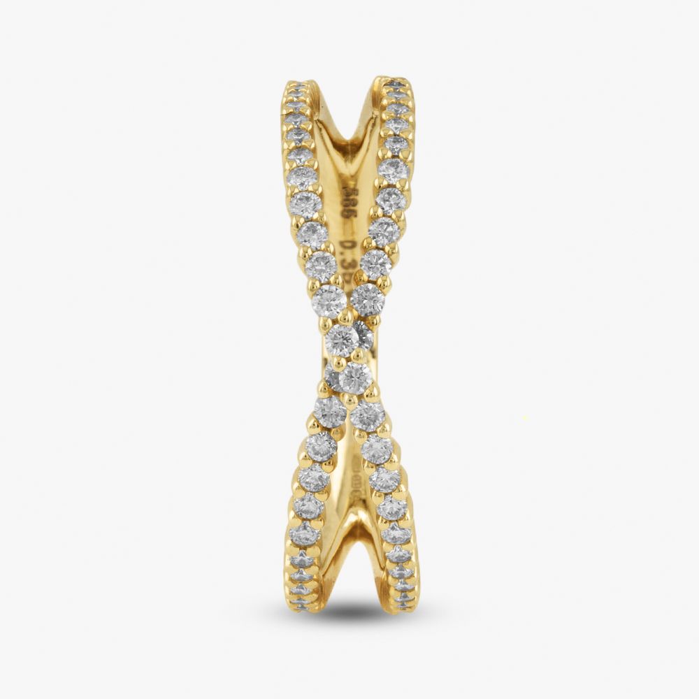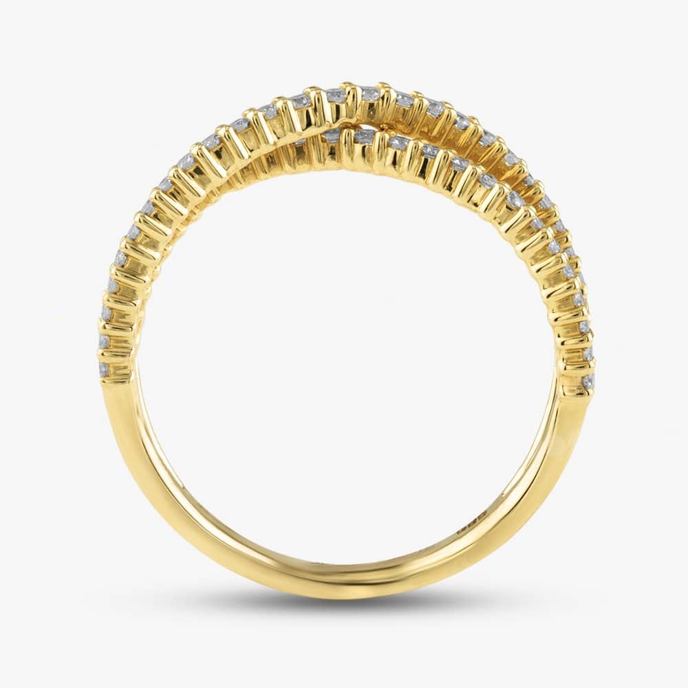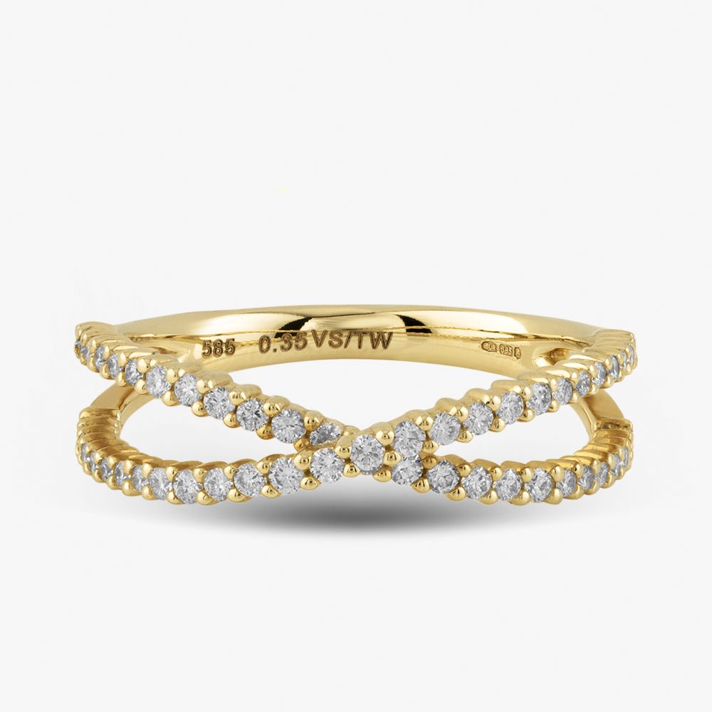 This stunning masterpiece of jewellery craftsmanship is a must-have. Exquisitely crafted from the finest 14ct yellow gold, this unique crossover ring is adorned with 0.35ct brilliant-cut white diamonds. The delicate design features two rows that gracefully intertwine, showcasing timeless elegance.