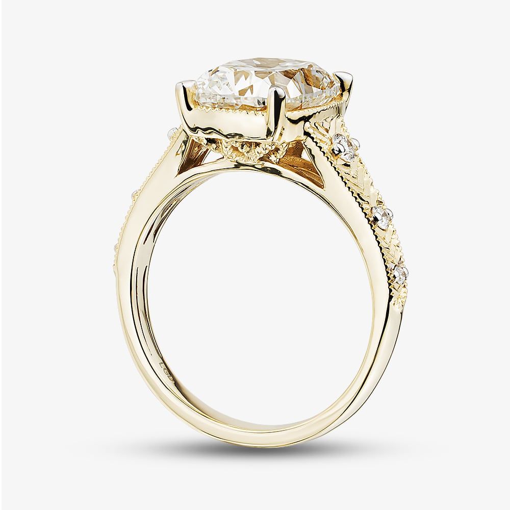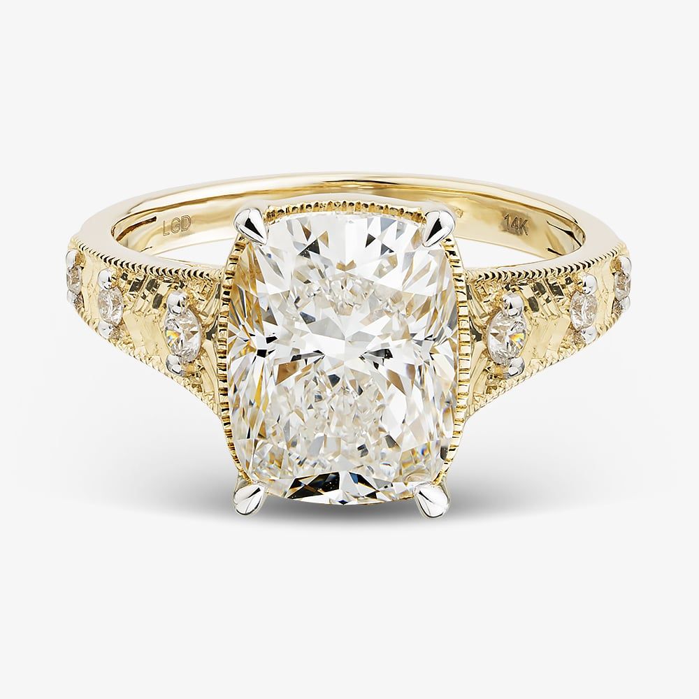 Radiate timeless luxury with the 14ct Yellow Gold Certified 4.15ct Cushion Cut Lab-Grown Diamond Shoulder Set Ring. Crafted in sumptuous 14ct yellow gold, it features a striking cushion-cut lab-grown diamond centre, elegantly framed by patterned shoulders set with brilliant-cut diamonds for added texture and brilliance. Perfect for special occasions or as a statement of enduring elegance, this exquisite piece embodies sophistication, glamour, and unforgettable sparkle.