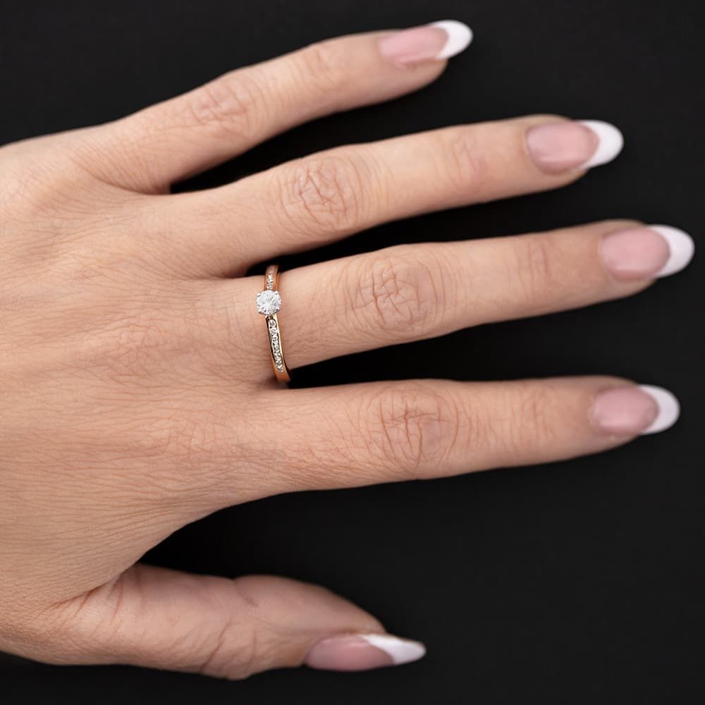 A stunning offering as an engagement ring, this ring features a certificated brilliant-cut 0.25ct centre diamond hand set in an 18ct White Gold four-claw V-shaped mount on an 18ct Rose Gold band with channel-set diamond shoulders.