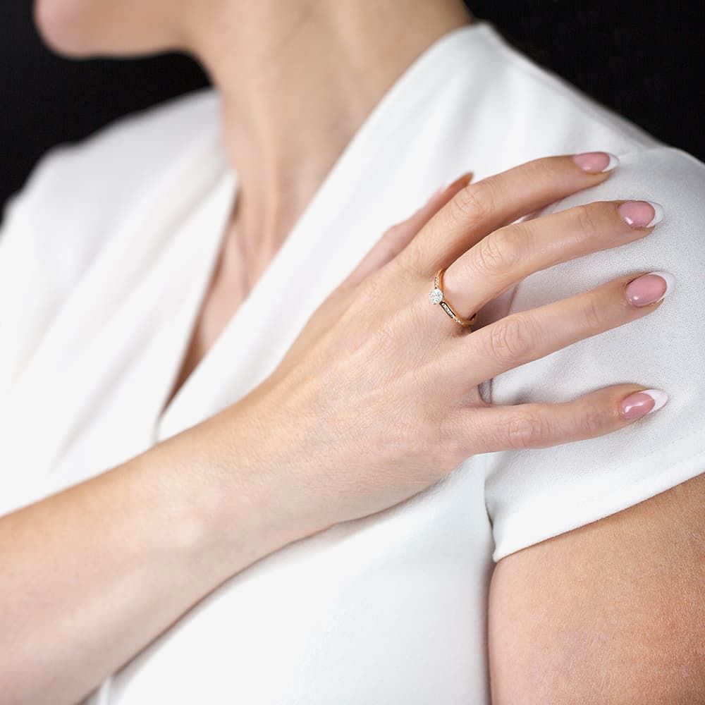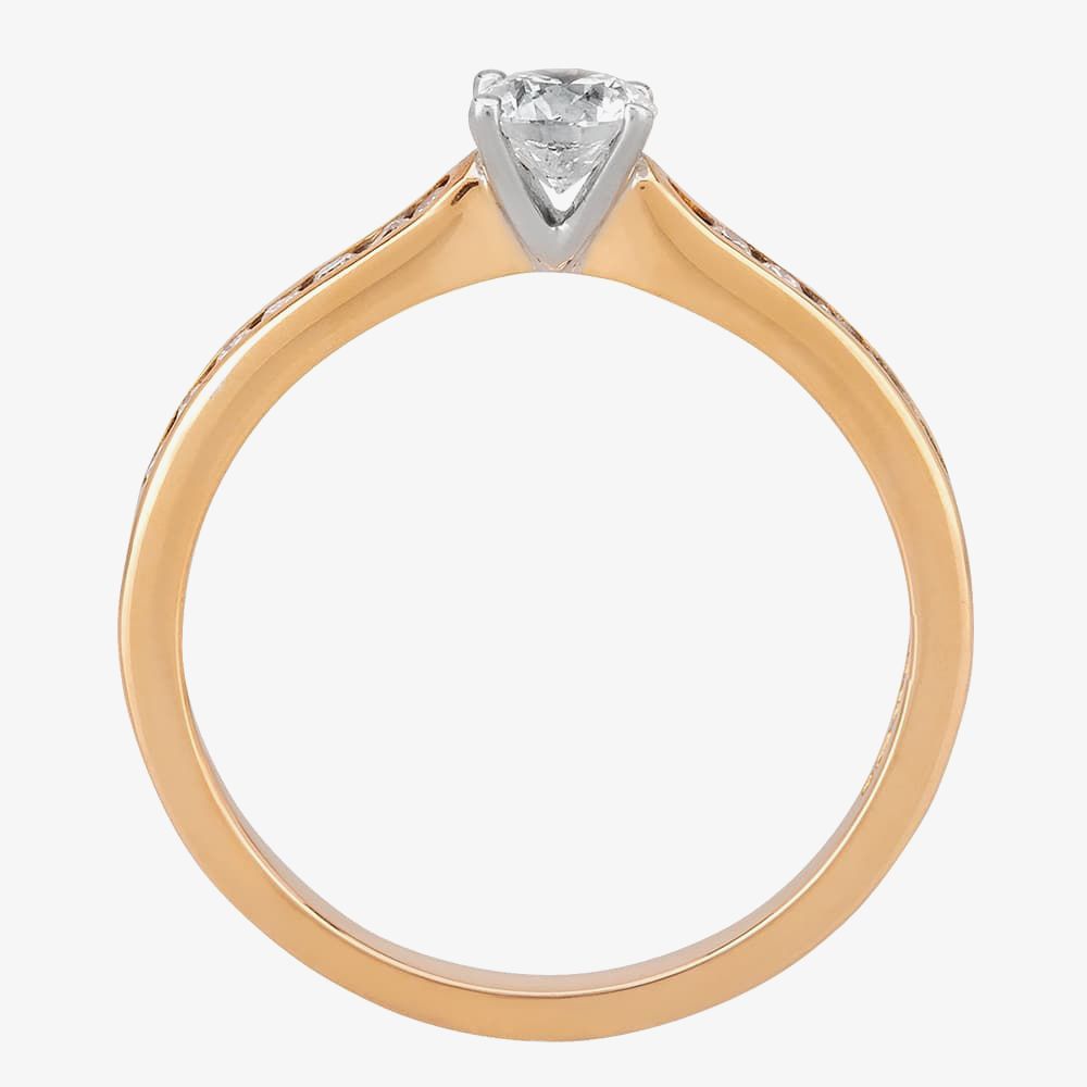 A stunning offering as an engagement ring, this ring features a certificated brilliant-cut 0.33ct centre diamond hand set in an 18ct White Gold four-claw V-shaped mount on an 18ct Rose Gold band with channel-set diamond shoulders.
