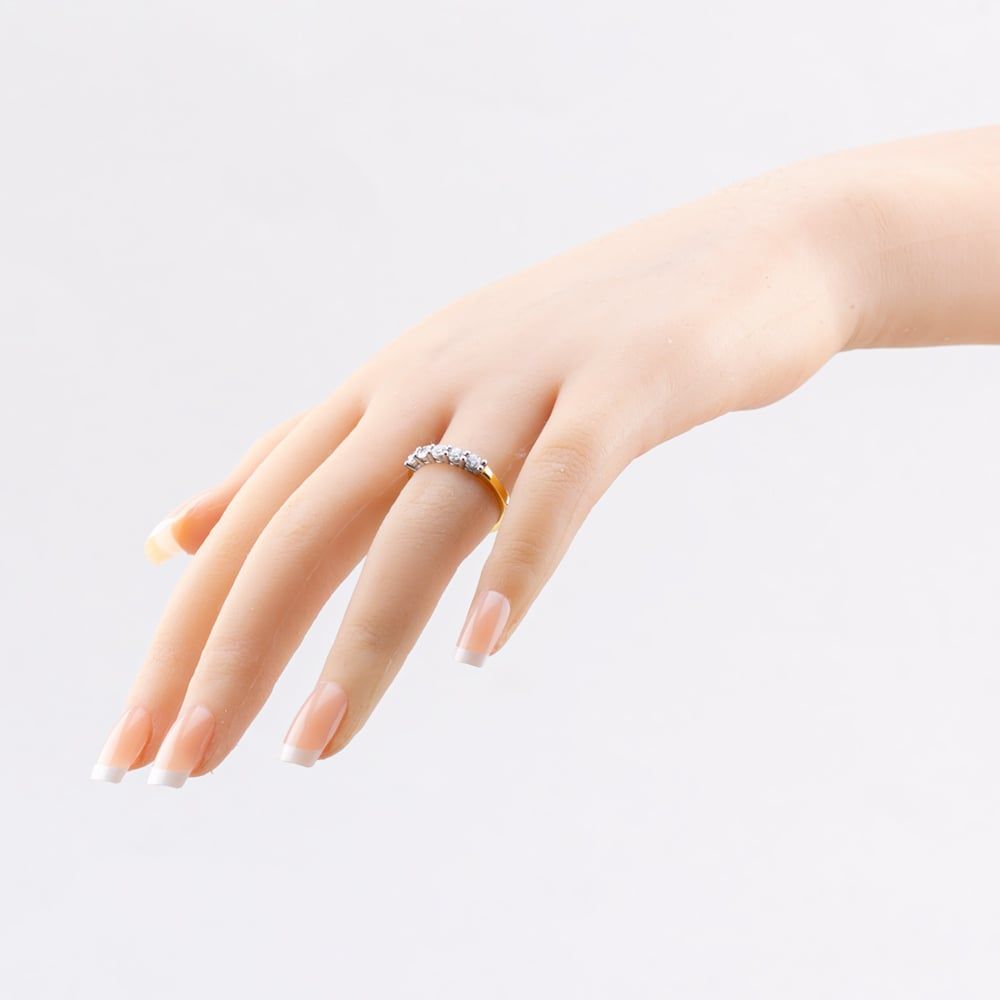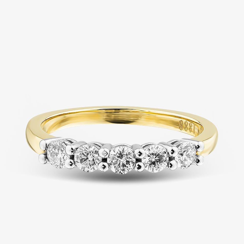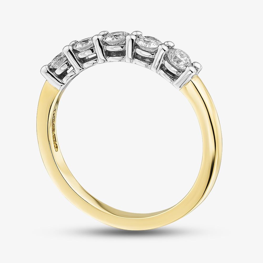 Five beautiful certificated round-cut diamonds, elegantly set in an 18ct yellow gold four-claw mount and a timeless, classic shaped band. Total diamond carat weight 0.50ct.