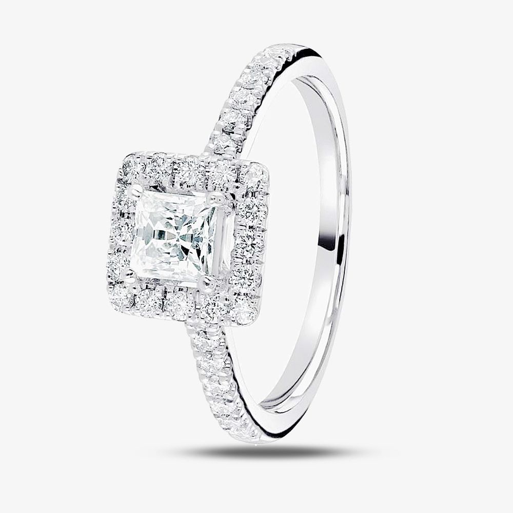 A stunning offering, this ring features a certificated 0.40ct princess-cut centre diamond which is hand set in a platinum four-claw mount and adorned by 0.37ct sparkling diamond set halo and shoulders design, with a total diamond weight of 0.77ct.