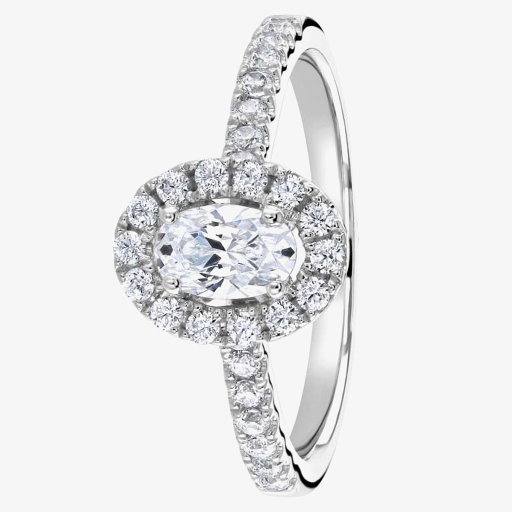 A gorgeous offering as an engagement ring set to be an eye-catching addition to any bridal set. This ring features a certificated oval cut centre diamond hand set in a platinum four-claw setting and framed with a diamond halo & diamond set shoulders. The certified centre stone of this ring is 0.70ct in weight, with the overall diamond weight totalling 1.16ct with the surrounding stones included.