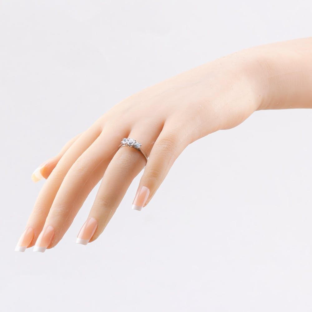 Three beautiful certificated round-cut diamonds, elegantly set in a platinum four claw mount and a timeless, classic shaped band. Total carat weight 0.75ct.