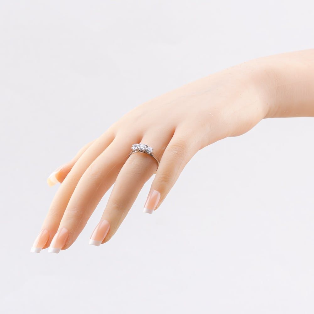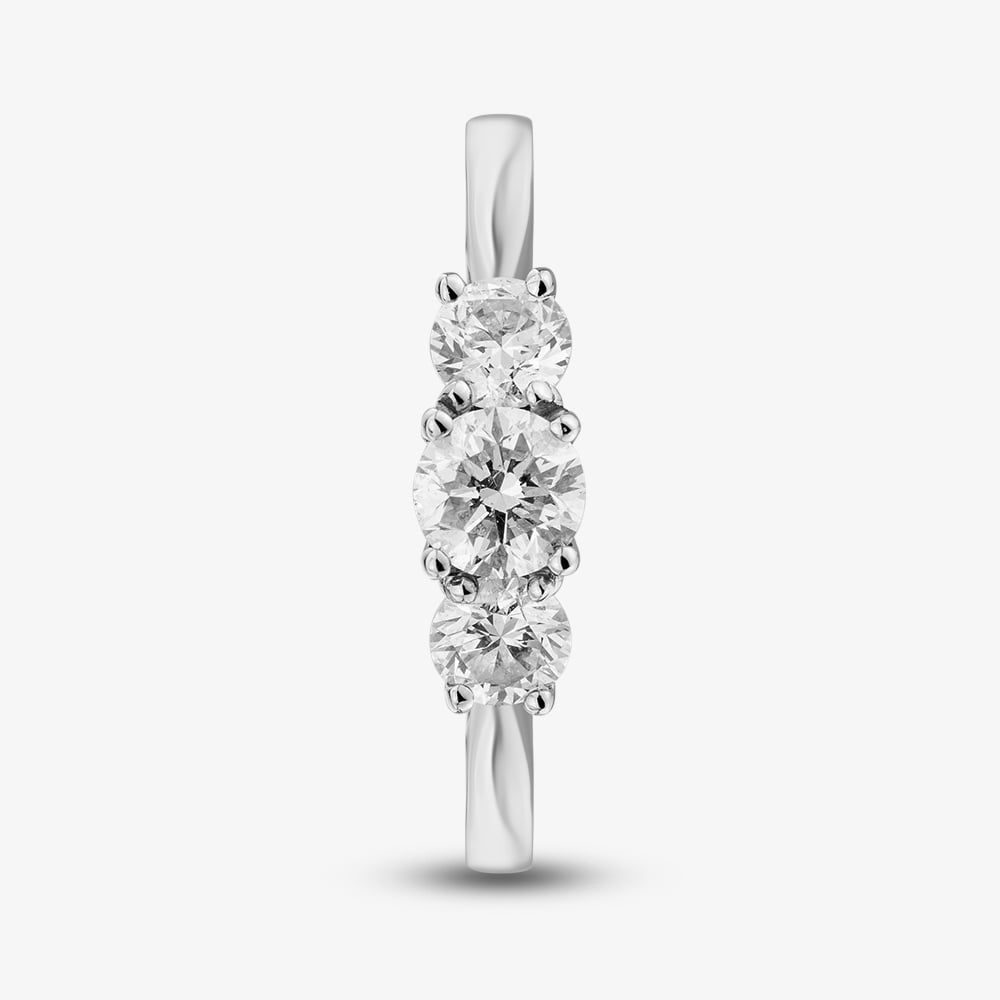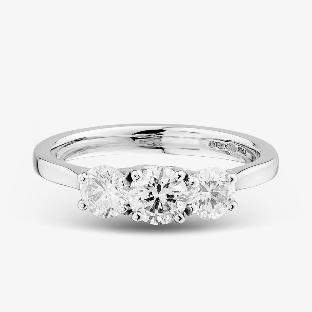 Three beautiful certificated round-cut diamonds, elegantly set in a platinum four claw mount and a timeless, classic shaped band. Total carat weight 1.00ct.
