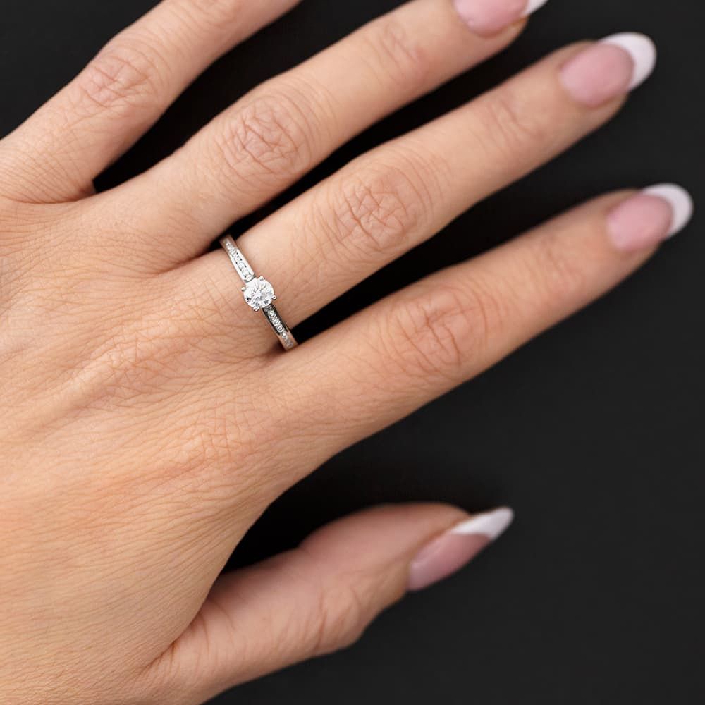 A stunning offering as an engagement ring, this ring features a certificated brilliant-cut 0.33ct centre diamond which is hand set on a platinum band & four-claw V-shaped mount with channel-set diamond shoulders.