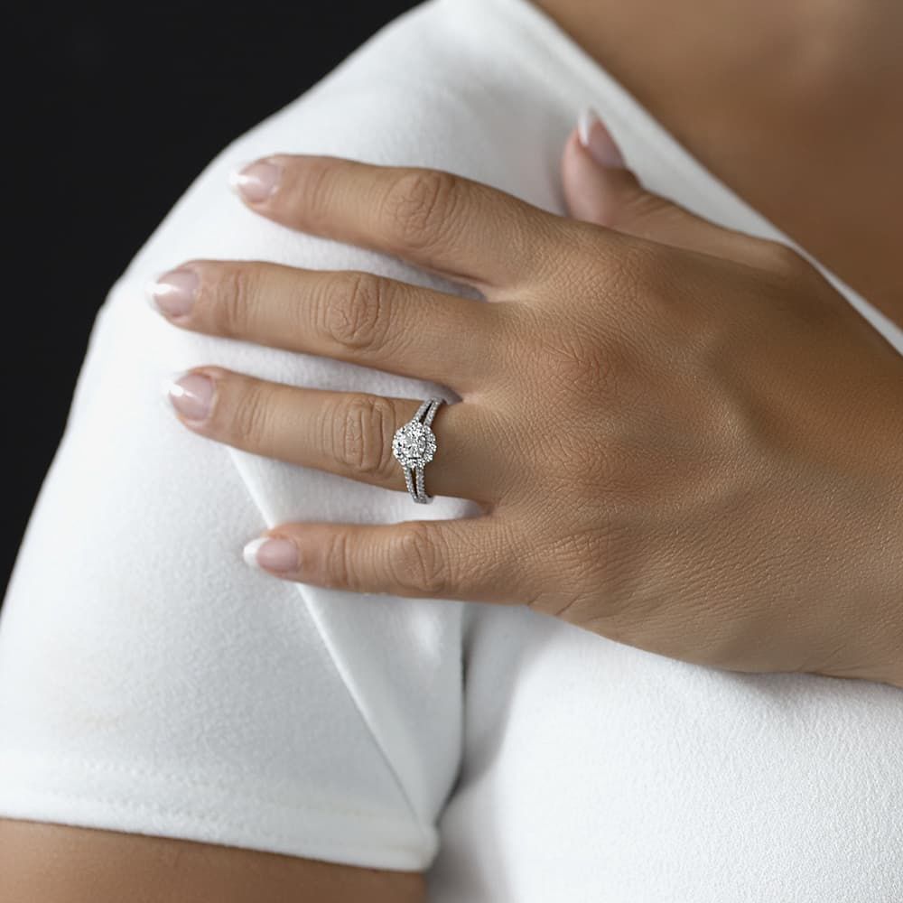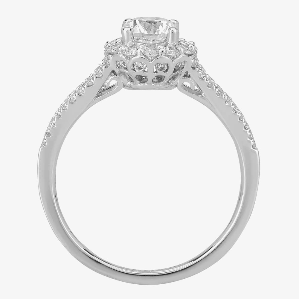 A stunning cluster ring which features a certificated 0.61ct brilliant-cut centre-stone diamond which is hand set in a platinum four-claw setting and framed with a 0.50ct diamond halo and split pave-set shoulders, with a total weight of 1.11ct.