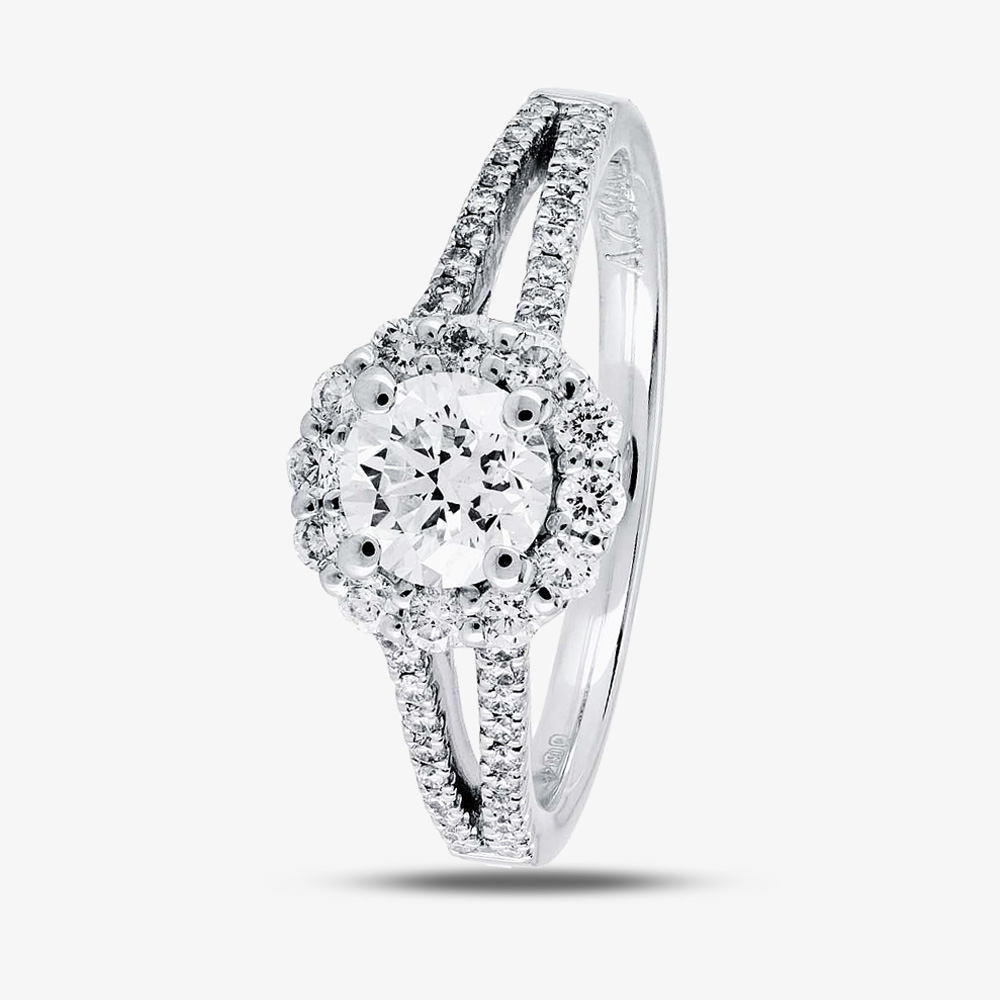 A certificated 0.70ct brilliant-cut centre-stone diamond which is hand set in a platinum four-claw setting and framed with a 0.50ct diamond halo and split pave-set shoulders, with a total weight 1.20ct.