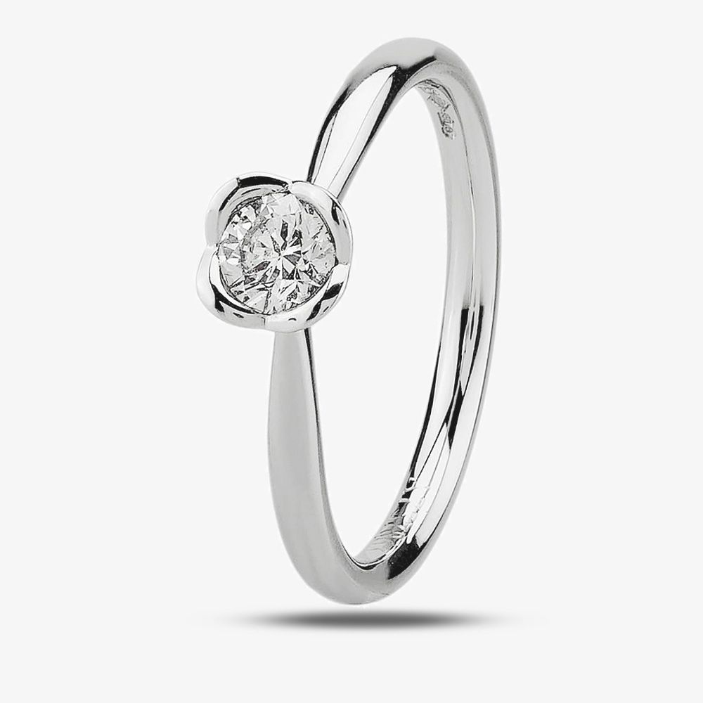 A platinum engagement ring where the diamond is set in a tall flower petal-shaped bezel. The diamond is certificated by EDR- the European Diamond report.