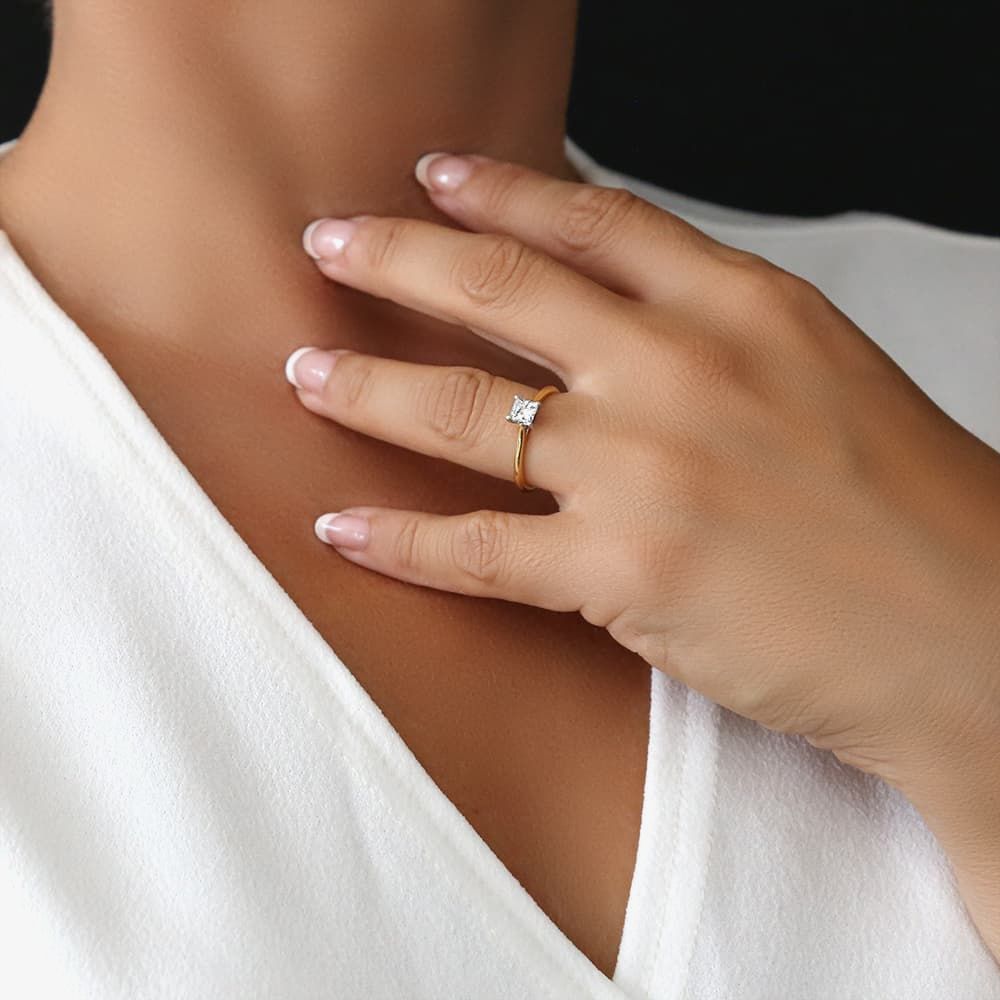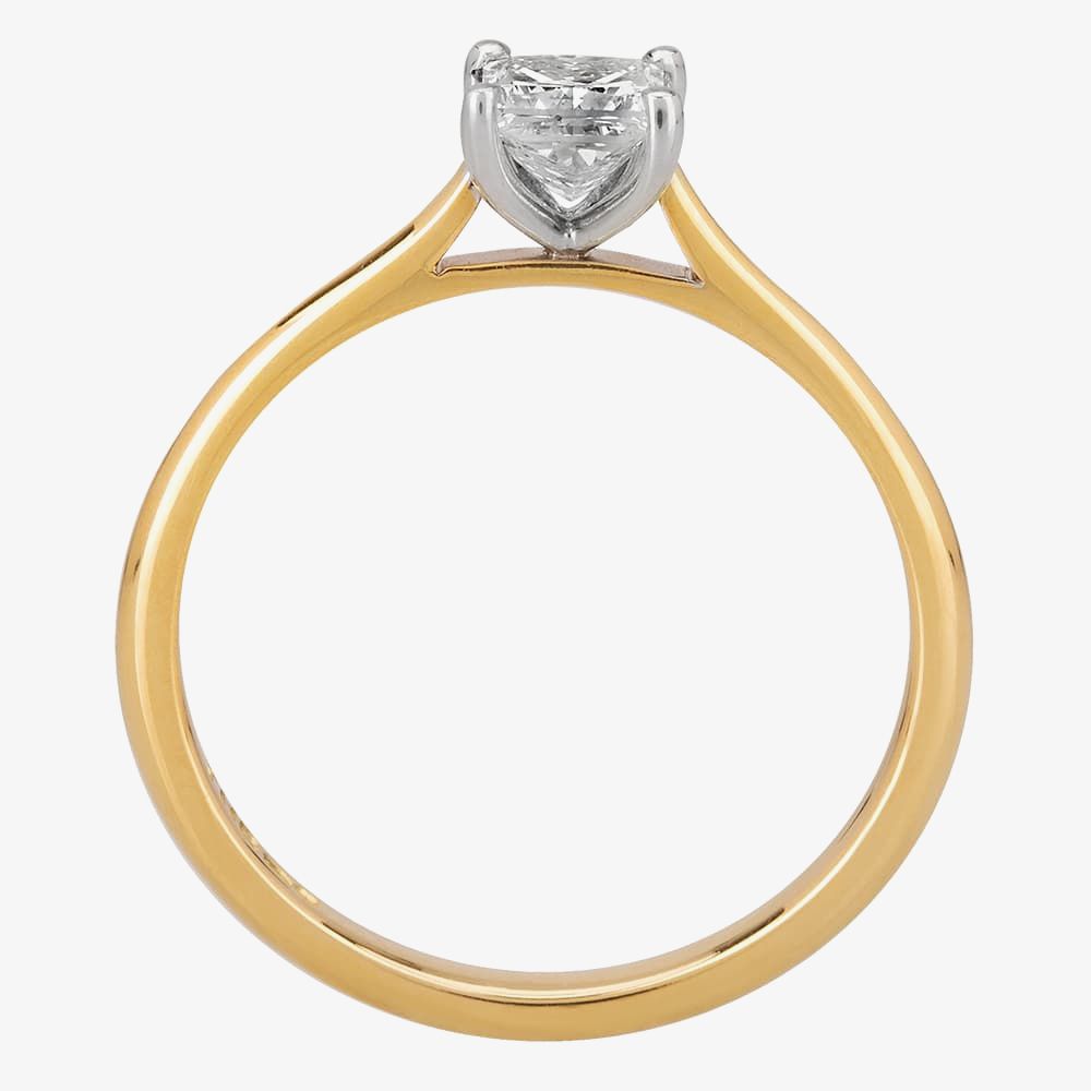 A princess-cut 0.50ct certificated diamond, hand set in an 18ct White Gold four-claw mount with open shoulders on the 18ct Yellow Gold band.