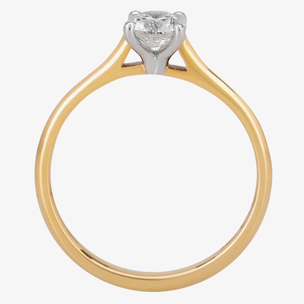A 0.50ct certificated round brilliant-cut diamond, hand set in an 18ct White gold four-claw tapered cathedral mount on an 18ct Yellow Gold band.