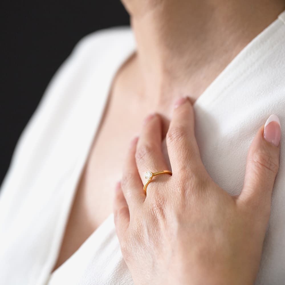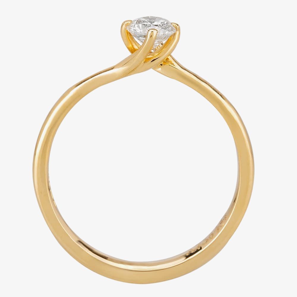 The perfect engagement ring for anyone who likes classic sparkle with unique design, this ring features a certificated 0.33ct round brilliant-cut diamond hand set in an 18ct yellow gold four-claw twisted mount.
