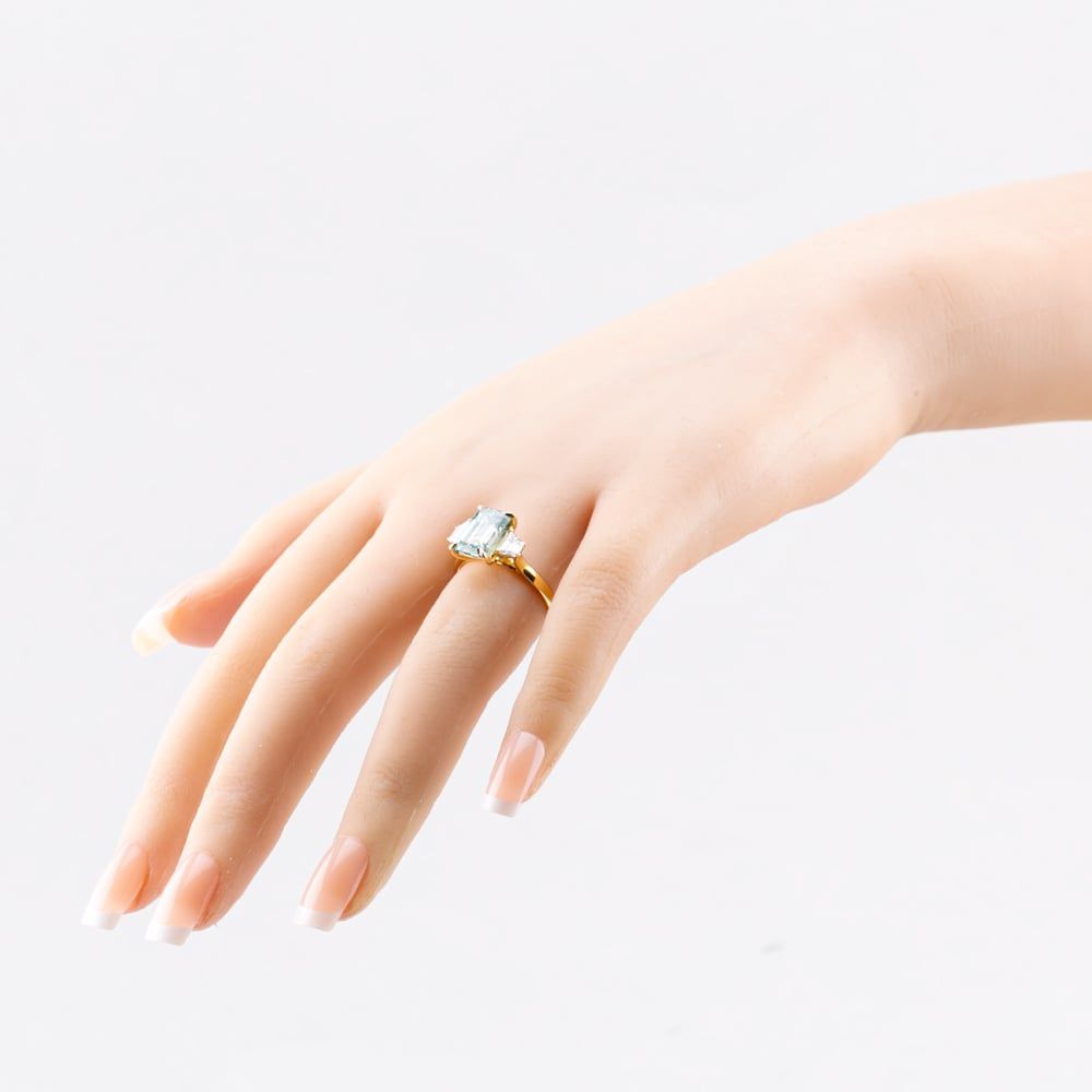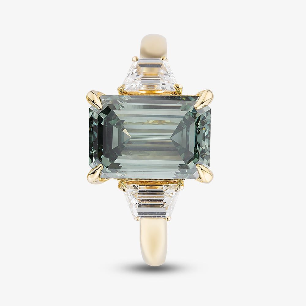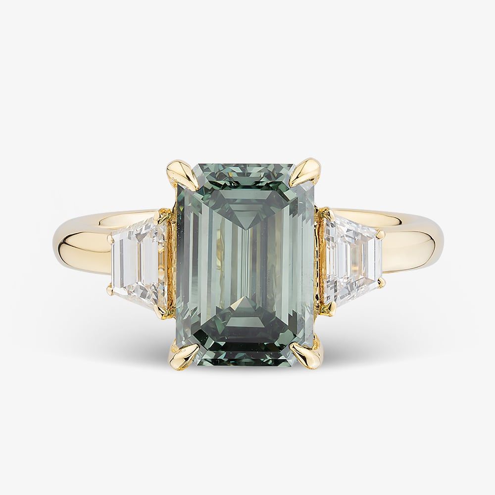 Experience unparalleled elegance with this 3.82ct lab-grown diamond trilogy ring. The 3.24ct emerald-cut Fancy Intense Bluish Green lab-grown diamond takes centre stage, flanked by two trapezoid-cut white lab-grown diamonds totaling 0.58ct, creating a striking contrast and radiant brilliance. Set on a rich 18ct yellow gold band, each ethically sourced, certified diamond exemplifies timeless luxury, exceptional craftsmanship, and vibrant colour. A statement piece designed for those who cherish refined sophistication and enduring beauty, perfect for marking unforgettable moments.