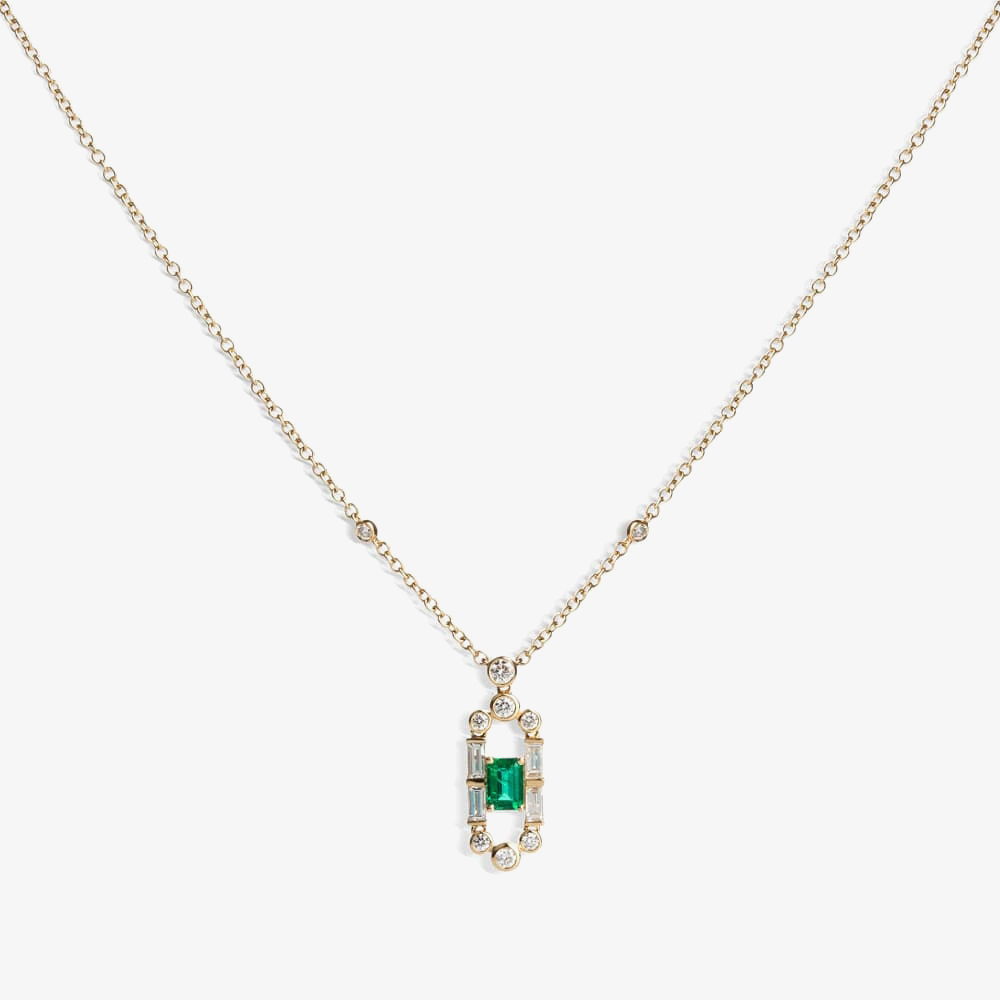 This luxurious necklace combines four bar-set baguette-cut and nine bezel-set round brilliant diamonds with a large central four-claw set emerald to create a geometrically arranged dropper that emulates the vintage styling of the 1920's.
