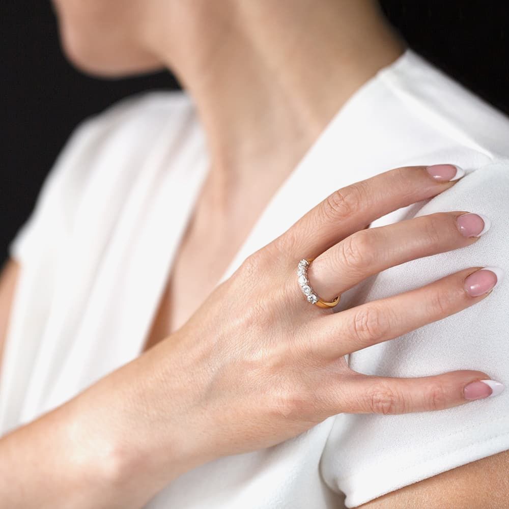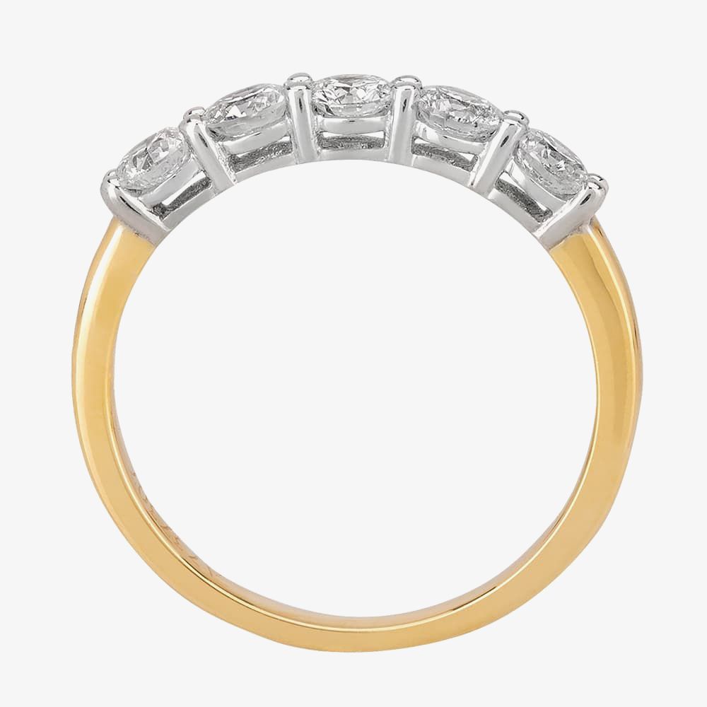 A stunning offering as an engagement ring, this ring features five certificated round brilliant-cut diamonds hand set in a 18ct white gold basket mount bridge on an 18ct yellow gold band, offering 0.75ct of diamond sparkle.