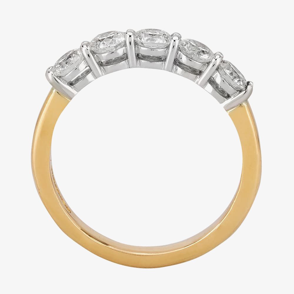 A stunning offering as an engagement ring, this ring features five certificated round brilliant-cut diamonds hand set in a 18ct white gold basket mount bridge on an 18ct yellow gold band, offering 1.01ct of diamond sparkle.