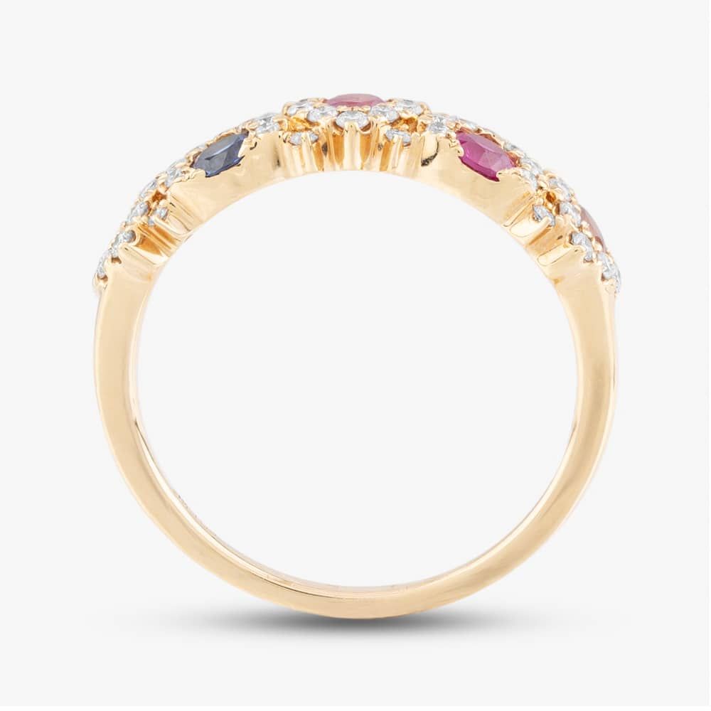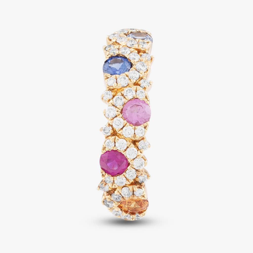 Embrace luxury with this captivating half-eternity ring. Delicately crafted from 18ct rose gold, it's adorned with dazzling white diamonds, pink rubies, and captivating sapphires in rich blue and fiery orange hues. This bold and vibrant combination reflects your individuality, turning heads and sparking conversations wherever you go.