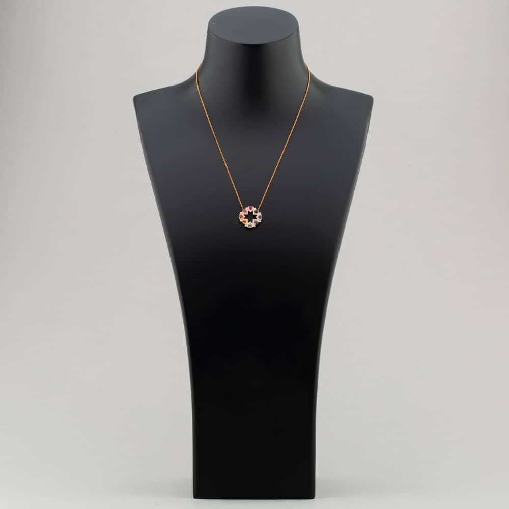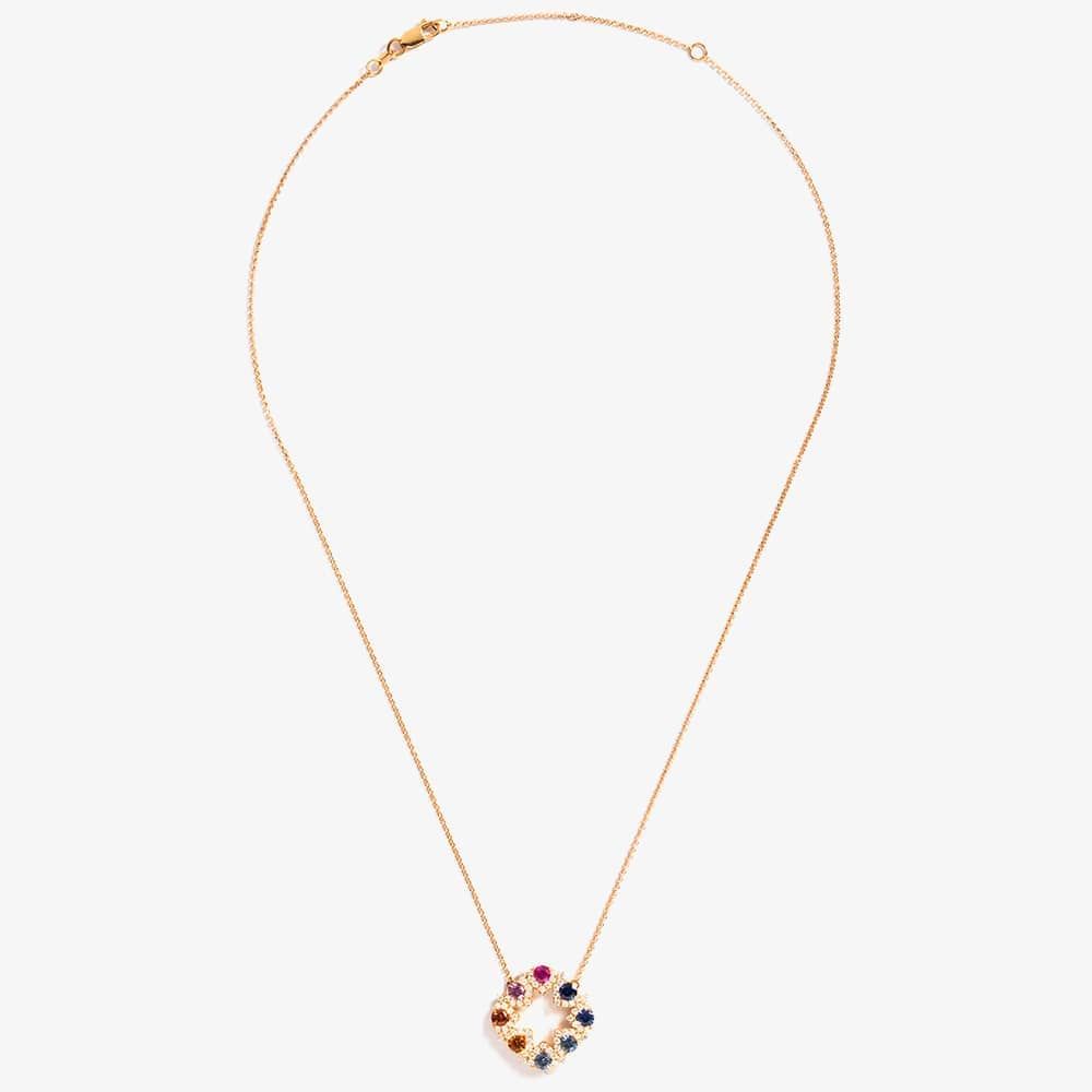 This 18ct rose gold necklace features a sleek adjustable belcher chain that beautifully suspends an openwork pendant adorned with dazzling white diamonds, pink rubies, and captivating sapphires in rich blue and fiery orange hues, securely fastened with a lobster claw clasp. This bold and vibrant combination reflects your individuality, turning heads and sparking conversations wherever you go.