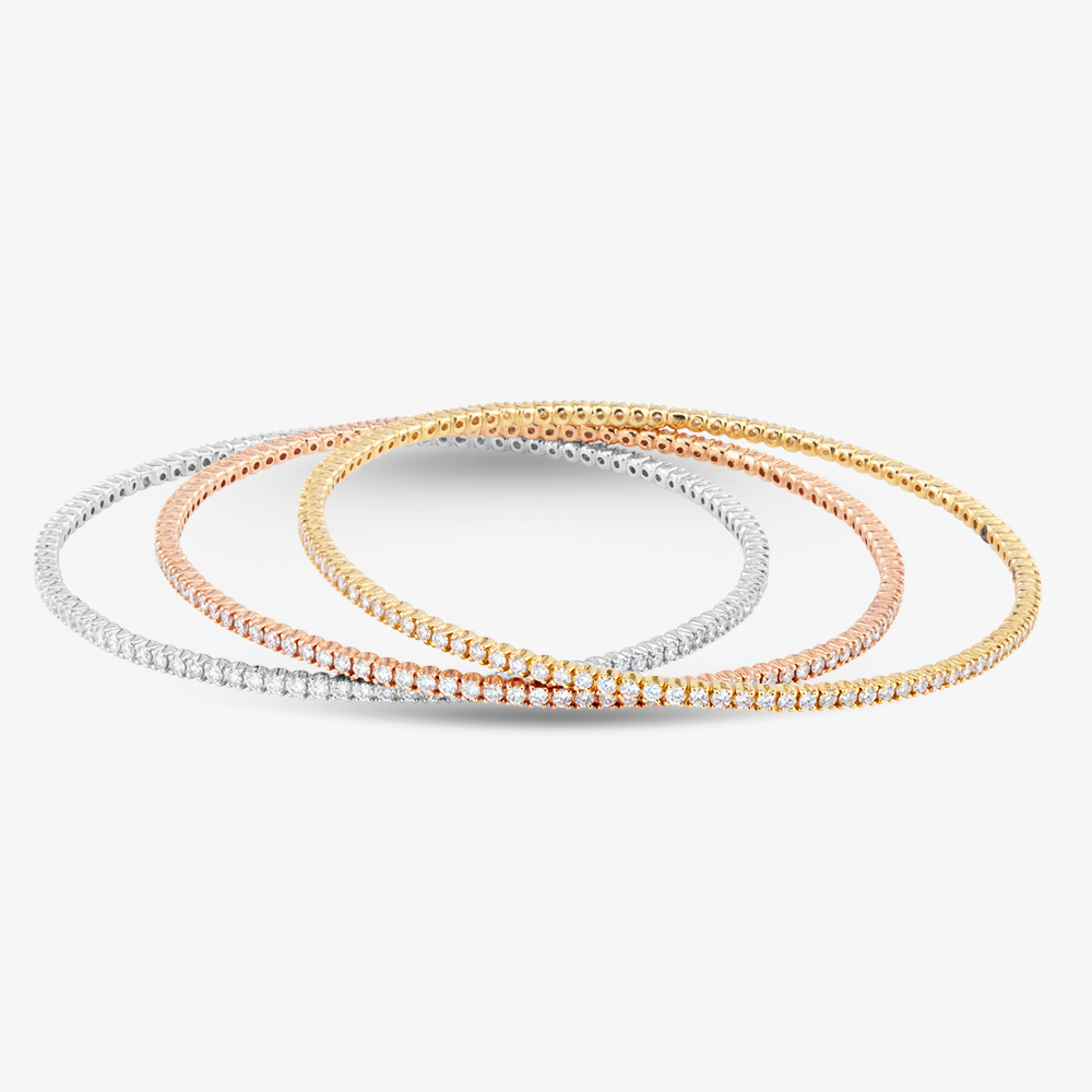 This 18ct three colour gold set of three bangle is expertly crafted for those who appreciate versatility and sophistication, adorned with brilliant cut diamonds totalling 6.09ct. This unique bangle is designed for both beauty and durability. The perfect gift for yourself or a loved one.