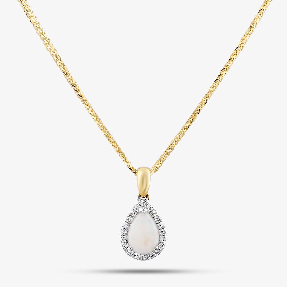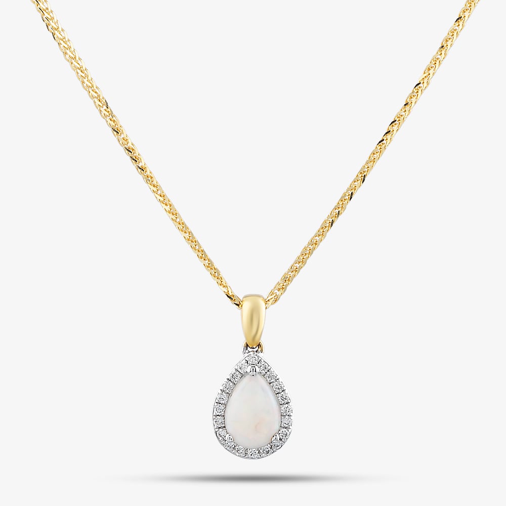 Celebrate a special occasion with this beautiful diamond and opal pendant necklace. Crafted from 18ct two colour yellow and white gold, the pendant features a stunning pear-cut opal at it's heart, surrounded by a shimmering row of white, brilliant-cut diamonds for maximum sparkle. Suspended from a yellow gold spiga to compliment the gold bale, this necklace is perfect for special occasion wear or makes a luxurious gift for a loved one.