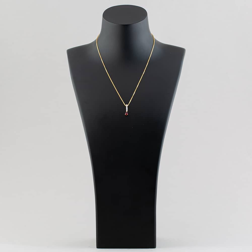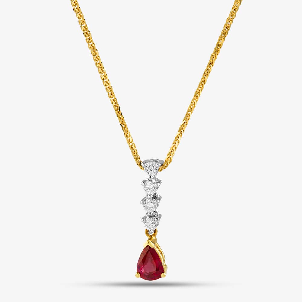 This 18ct two-colour gold necklace features a sleek adjustable Spiga chain that beautifully suspends a pear-cut ruby centre stone with four brilliant-cut white diamonds above the ruby, adding a touch of sparkle and elegance. The minimalist design allows the ruby’s natural brilliance to take centre stage, which promises to sparkle with every movement, making this necklace a timeless symbol of subtle luxury.