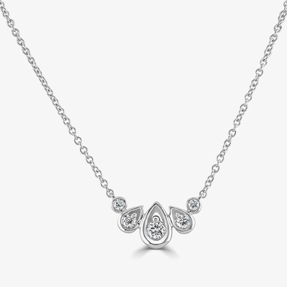This elegant graduated teardrop necklace is crafted in 18ct white gold & features 0.27ct of rubover set brilliant cut diamonds which catch the light beautifully. A contemporary & stylish necklace to add a touch of sparkle to any outfit. Diamond Clarity SI Diamond Colour H