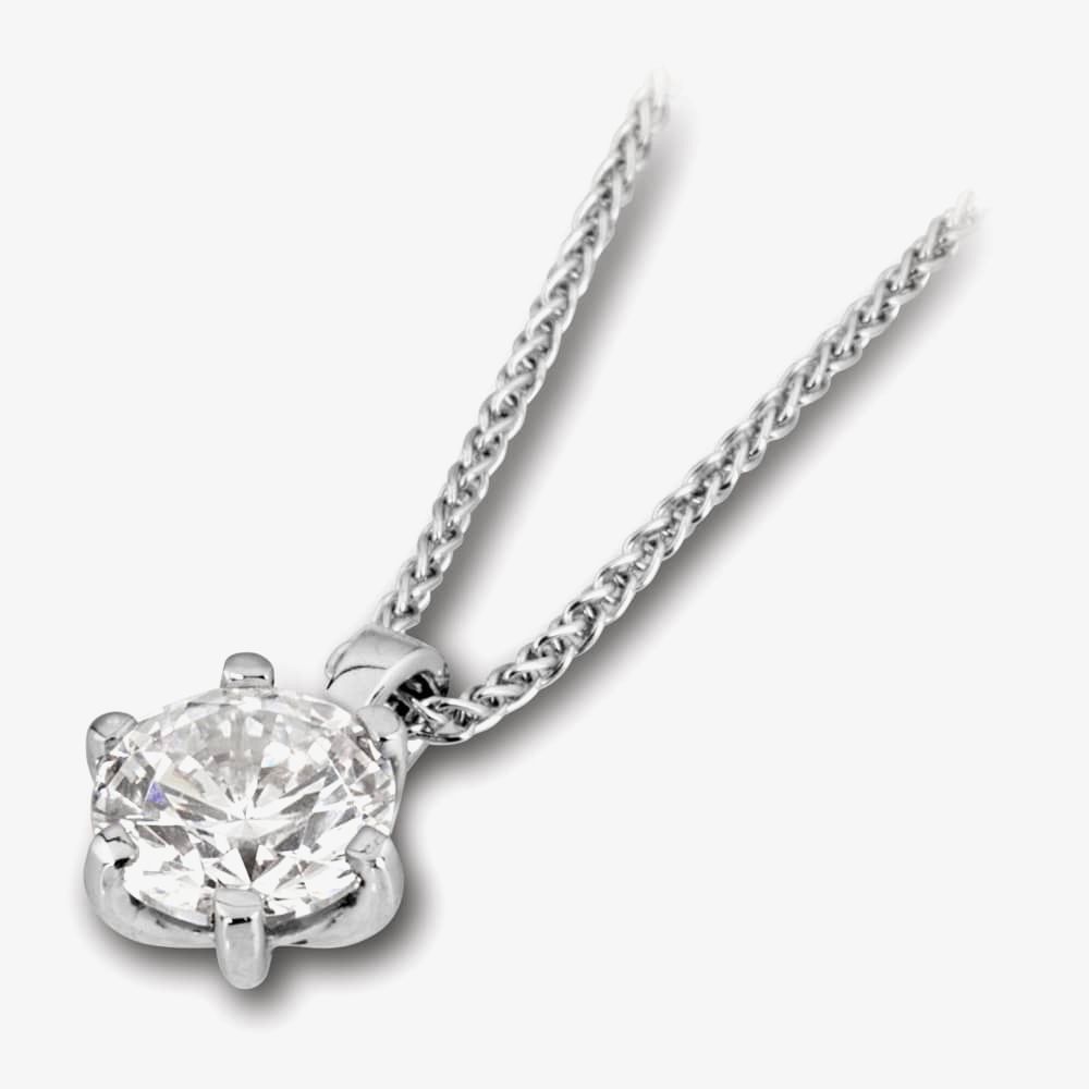 This exquisitely crafted 18ct white gold necklace features a glistening 0.40ct brilliant round diamond pendant. The diamond is beautifully accentuated by it's lustrous 6 claw setting which allows maximum light penetration to give the diamond a dazzling allure. Charmingly finished with an 18" diamond cut curb chain this wonderful pendant will add a touch of sophistication to your everyday wear.