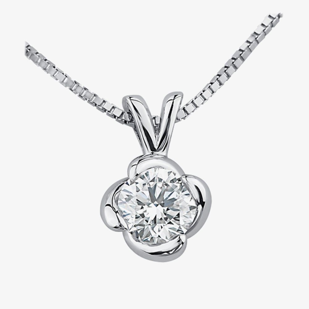 A stunning single stone necklace crafted from 18ct white gold and features a round brilliant cut diamond with an eye catching twist four claw setting with a total carat weight of 0.50ct. Finished on a box chain that measures aprroximately 18 inches. Certificated Diamond Clarity VS1-VS2 Diamond Colour G