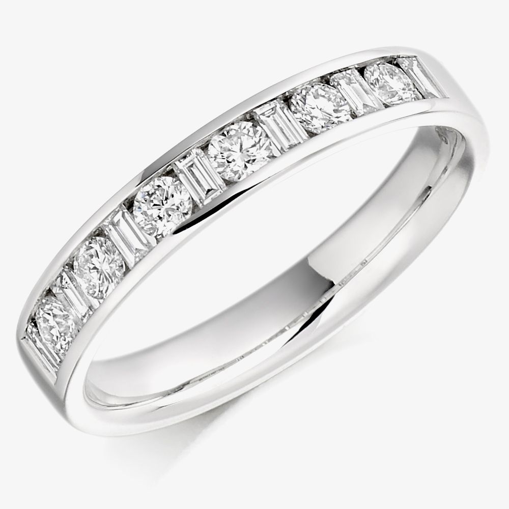 A band of sparkling diamond weighing in excess of half a carat and neatly set in a shiny 18 carat white gold band, perfect for signifying your everlasting commitment.