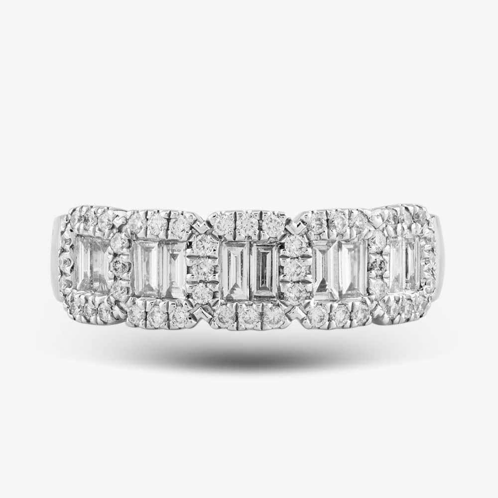 This ring contains a total of 0.58ct diamonds, this exquisite piece features mesmerising baguette-cut diamonds, encircled by a halo of brilliant-cut diamonds. The seamless fusion of classic and contemporary design elements makes this ring a captivating symbol of everlasting love and sophistication.
