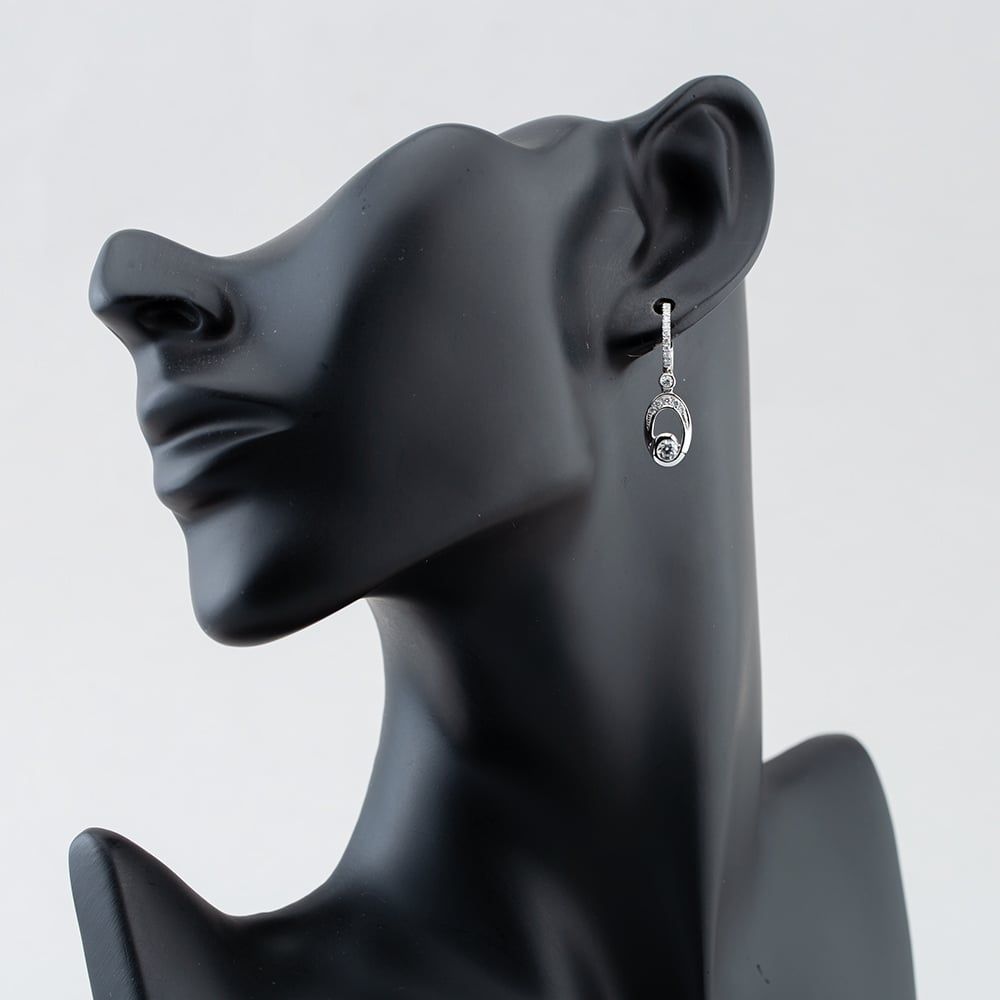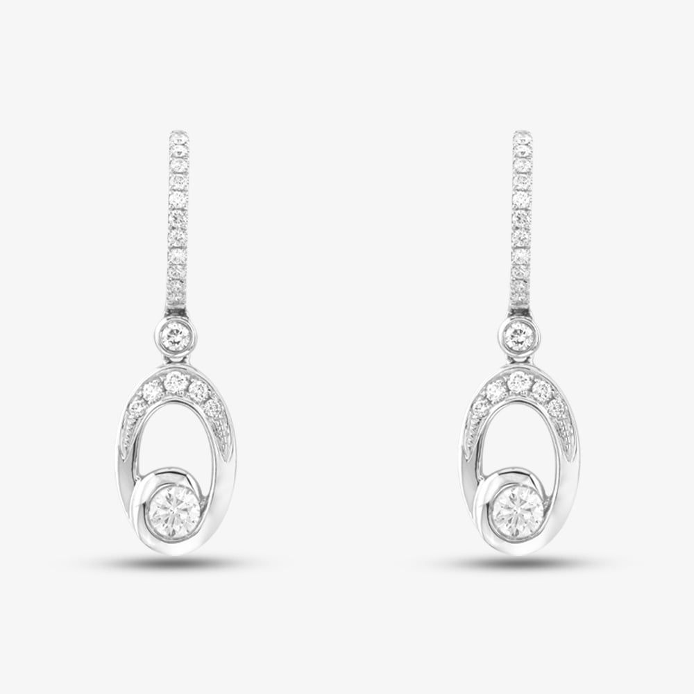 Chic 18ct white gold huggie drop earrings showcasing an open oval design adorned with 0.70ct brilliant-cut diamonds, offering a modern and elegant sparkle.