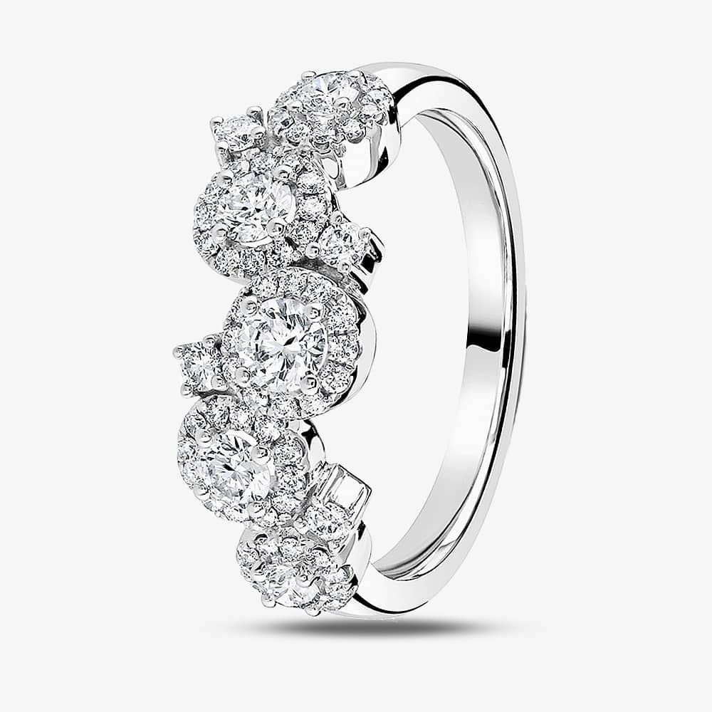 An eye-catching halo cluster band ring crafted in 18ct white gold & features 0.71ct of claw set brilliant cut diamonds which catch the light beautifully. A contemporary & stylish ring to add a touch of sparkle to any outfit. Diamond Clarity SI Diamond Colour H