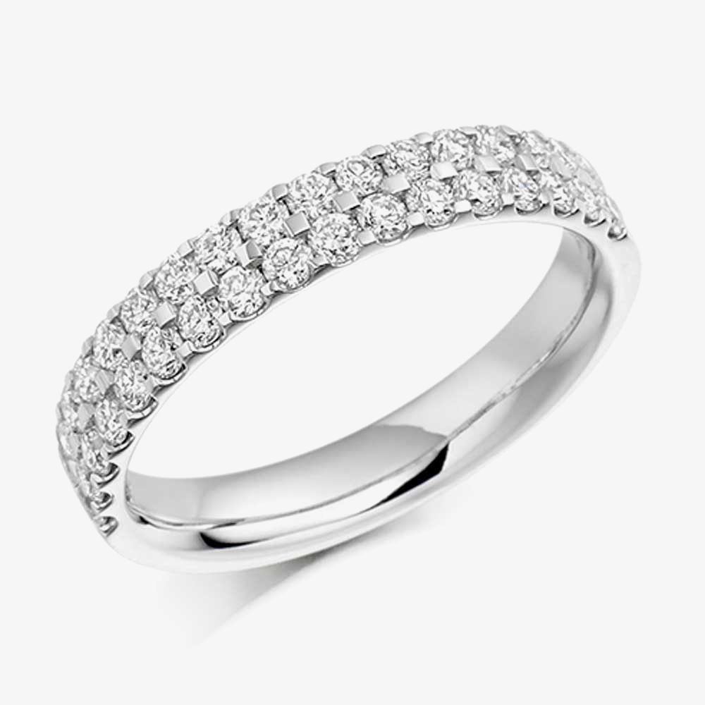 Set with 0.75ct of round brilliant diamonds, this claw set 18ct white gold half eternity ring is elegant and sophisticated. Featuring a double row of stones to maximise the light reflected from the surface, this piece can be worn as part of a complementary bridal set or as part of a luxurious stacking ring set with similarly shaped stones.