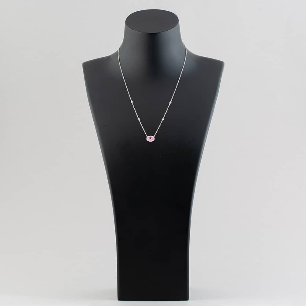 Embrace the timeless beauty of this pink sapphire halo necklace. Crafted from 18ct white gold, it showcases a 0.90ct pink sapphire centre stone, accentuated with a 0.19ct brilliant-cut white diamond halo, suspended on an adjustable trace chain, securely fastened with a lobster claw clasp. This necklace is perfect for everyday wear or adding a touch of sophistication to a special occasion.