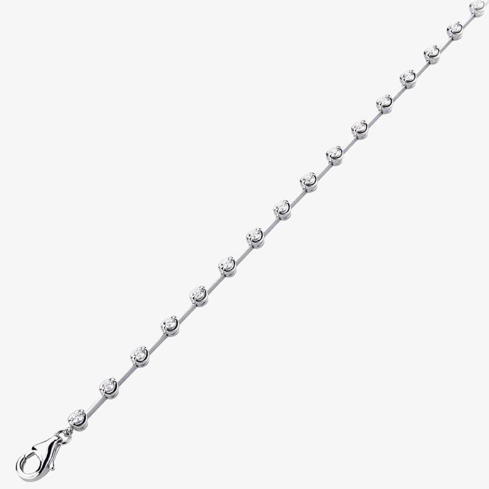 This sophisticated bracelet is crafted in 18ct white gold & features a total of 1.00ct round encased diamonds which catch the light beautifully & a plain bar design in between each diamond. This bracelet is finished with a lobster style clasp fastening. A contemporary & stylish bracelet to add a touch of sparkle to any outfit.