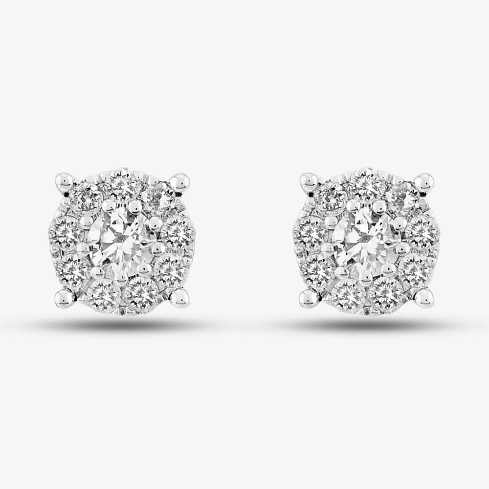 A matching pendant and stud earring set, where the focal point of each piece is the nine-claw centre diamond, which is surrounded by a halo of nine smaller stones.