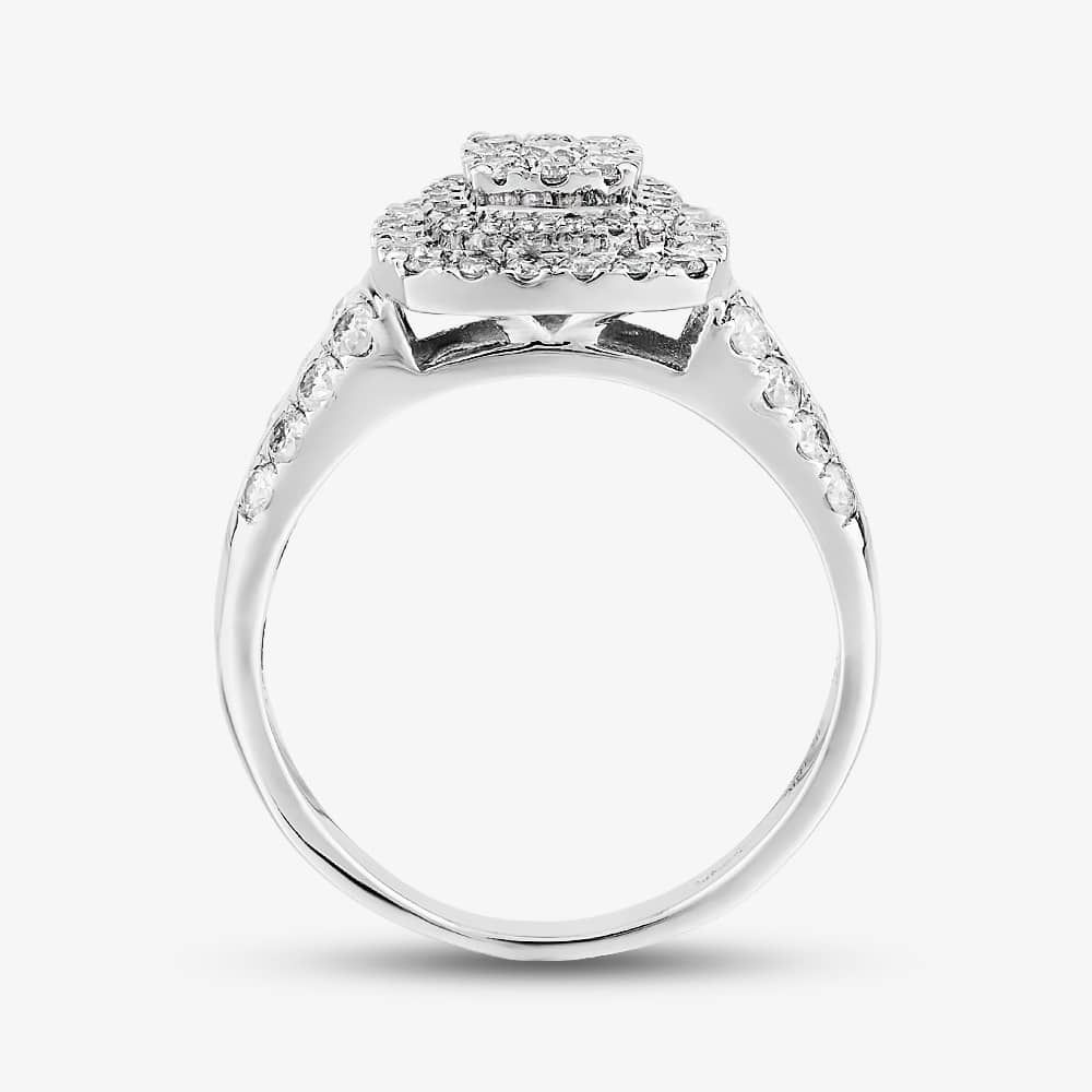 Our 18ct White Gold 1.00ct Diamond Shouldered Cushion Cluster Ring. This exquisite piece boasts a stunning 1.00 carat square shaped diamond cluster at its centre, accentuated by shoulder diamonds, totalling 1.00 carats of brilliance. Set in lustrous 18ct white gold, it seamlessly blends sophistication and style. Whether as an engagement ring or a symbol of your impeccable taste, it's a testament to enduring beauty. Make it yours and let this ring be a radiant statement of love and refinement that captures every gaze.