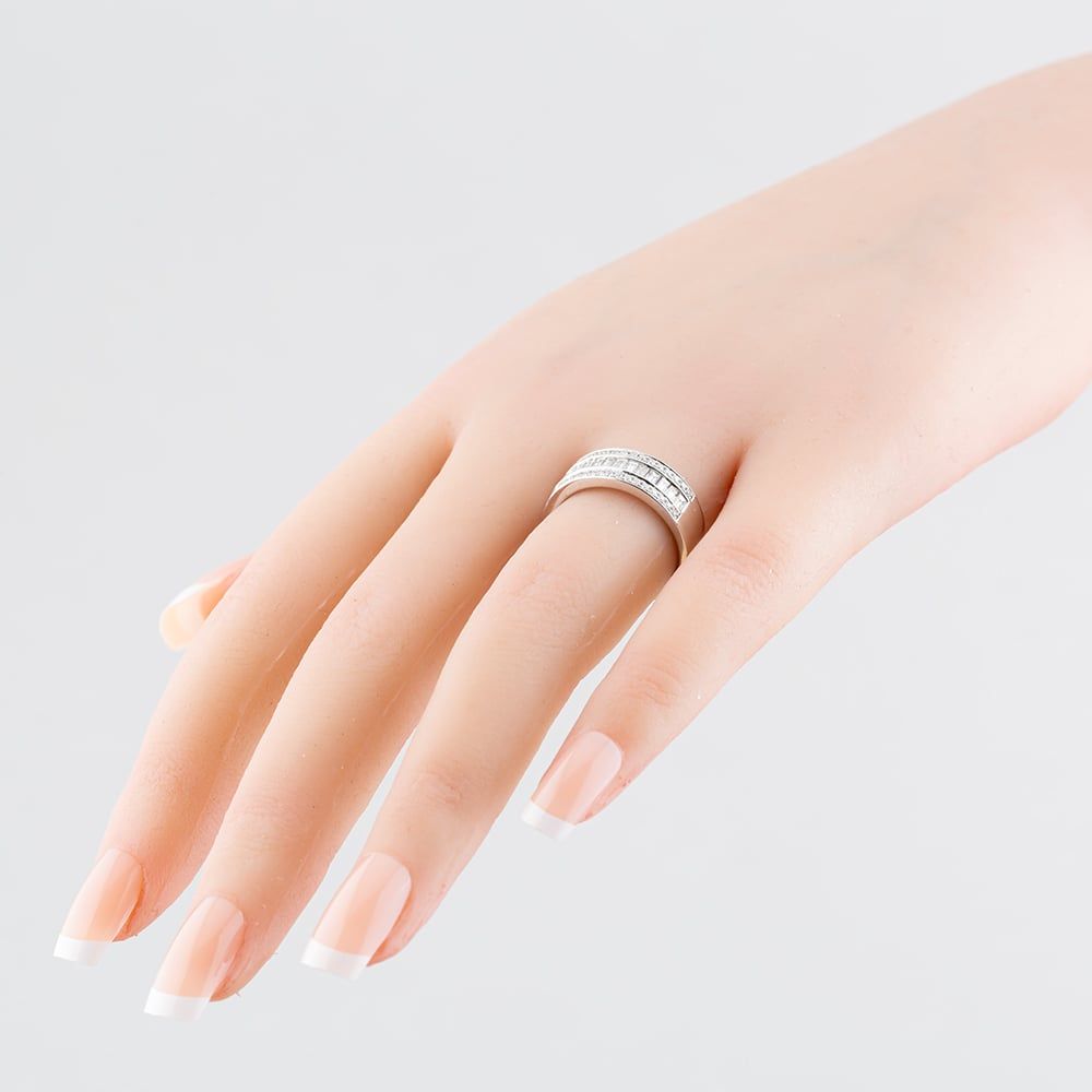 A dazzling 18ct white gold half eternity ring featuring three rows of diamonds, with a stunning combination of princess and baguette-cut diamonds. The intricate design exudes luxury and elegance, offering a timeless and sophisticated look.