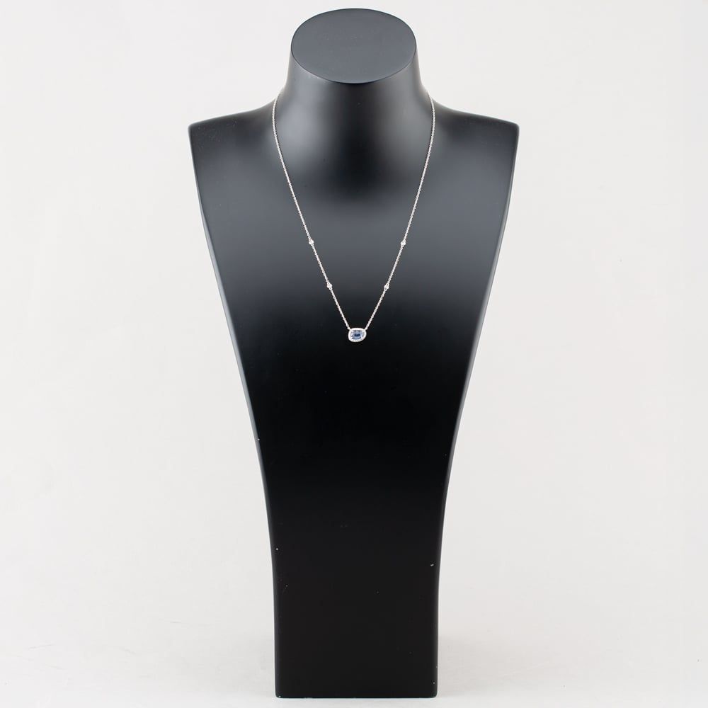 Refined and elegant, this beautiful necklace crafted from radiant 18ct white gold is perfect for gifting and marking a special occasion. A rich blue 1.06ct sapphire sits at the heart in a four-claw setting for maximum sparkle, surrounded by an array of white, round cut diamonds. Attached to an 18ct white gold chain detailed with bezel set diamonds, this stunning necklace can be treasured for years to come.