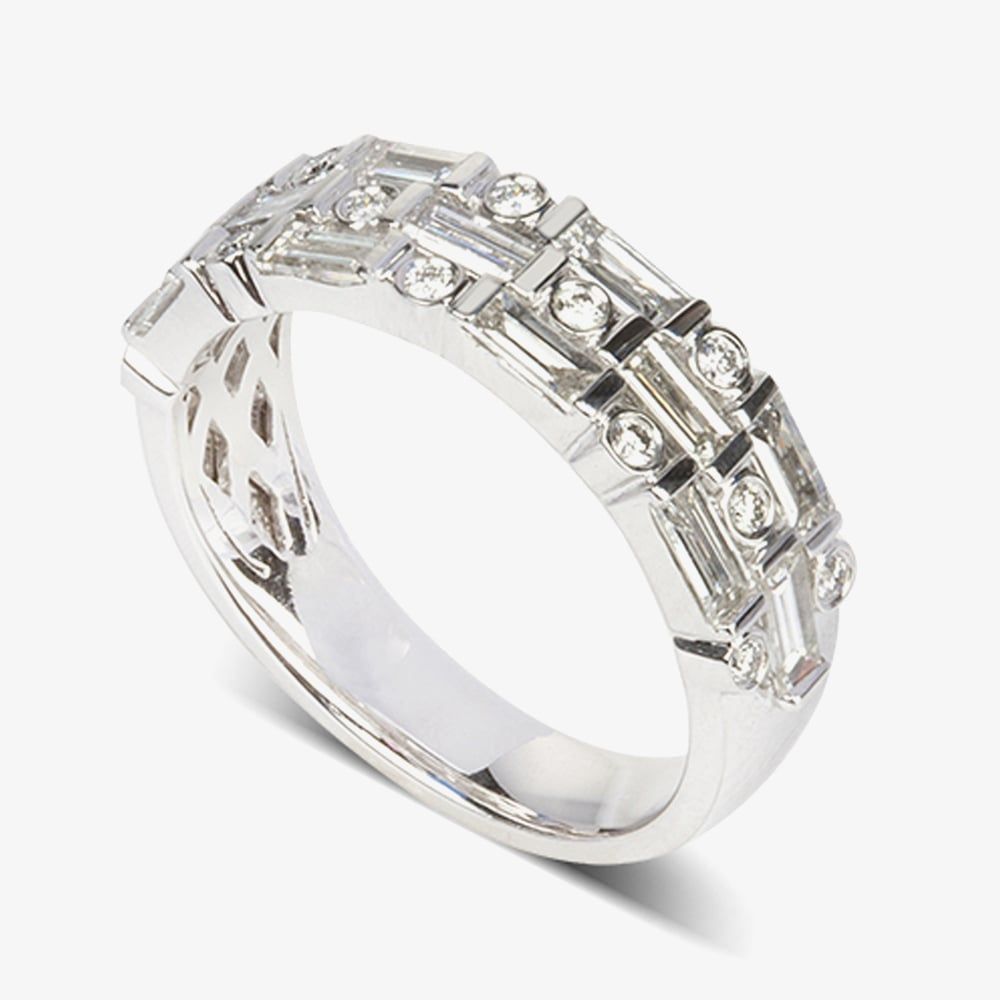 An eye-catching three row band ring crafted in 18ct white gold & features 1.34ct of rubover set brilliant & baguette cut diamonds which catch the light beautifully. A contemporary & stylish ring to add a touch of sparkle to any outfit. Diamond Clarity SI Diamond Colour H