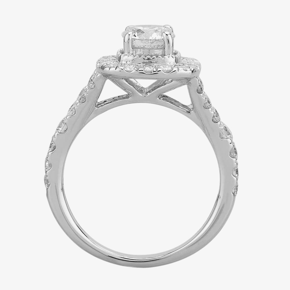 A large centre diamond is held in a four claw beaded frame before being surrounded by a square halo of smaller stones to create an eye-catching mount. Pave-set split shoulders flow down from the halo to graduate down to the smooth 18ct white gold shank.