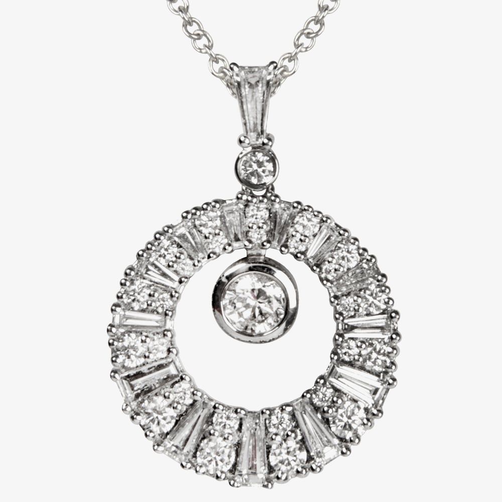 This statement open circle design necklace is crafted in 18ct white gold & features 1.55ct of rubover & claw set baguette & brilliant cut diamonds which catch the light beautifully. A contemporary & stylish necklace to add a touch of sparkle to any outfit.