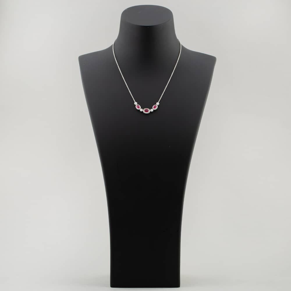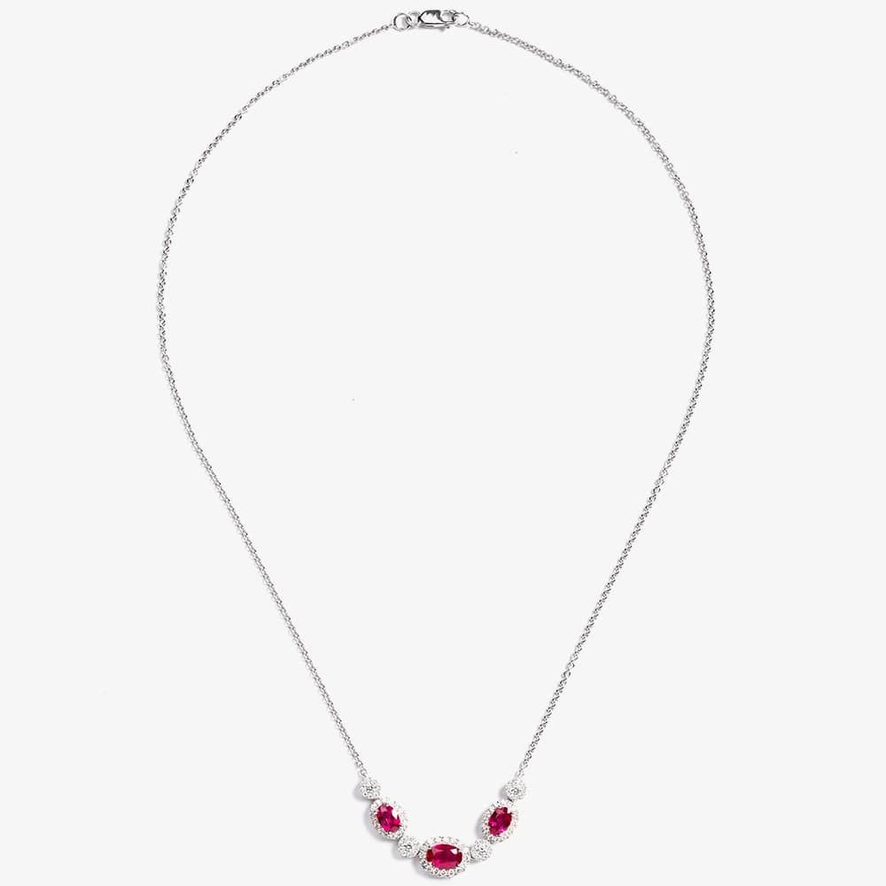 This 18ct white gold necklet features a sleek trace chain that beautifully suspends 1.67ct of oval-cut rubies surrounded by a halo of 0.68ct brilliant-cut diamonds in an alternating pattern, securely fastened with a lobster claw clasp. The minimalist design allows the ruby's natural brilliance to take centre stage, which promises to sparkle with every movement, making this necklace a timeless symbol of subtle luxury.