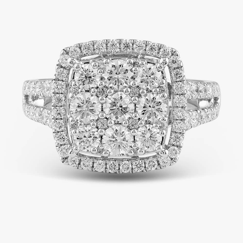 This stunning masterpiece of jewellery craftsmanship is a must-have. Exquisitely crafted from the finest 18ct white gold, this delicate shoulder-set cluster ring is adorned with 1.73ct of brilliant-cut white diamonds. The diamonds are set in a basket-four-claw setting, enhancing their brilliance. The centre stones are accentuated by brilliant-cut white diamond split shoulders and a halo, set in a classic four-claw setting.