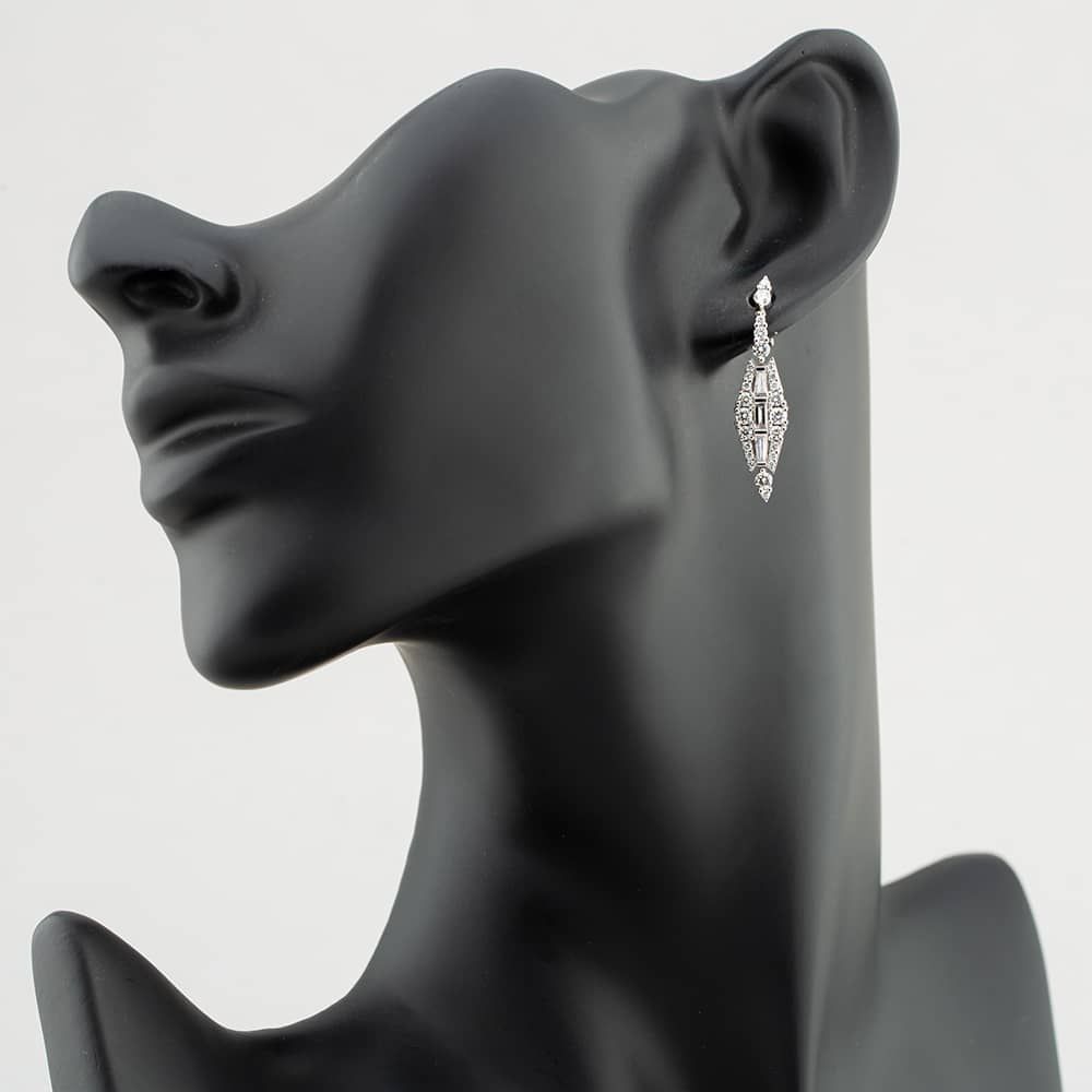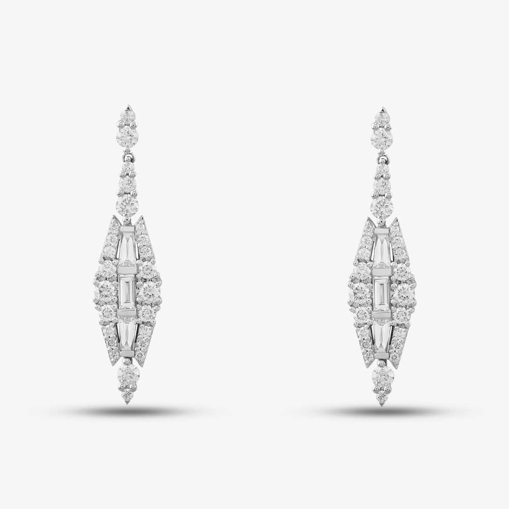 Each earring is in a unique marquise-diamond shape, adorned with a mesmerising array of diamonds. The centre is filled with exquisite baguette-cut diamonds, lending a sense of sophistication and artistry to the design. Surrounded with brilliant-cut diamonds, carefully placed along the edges. With a total carat weight of 1.75ct, these earrings are secured with butterfly backings. The diamonds have a colour of H and a clarity of SI.