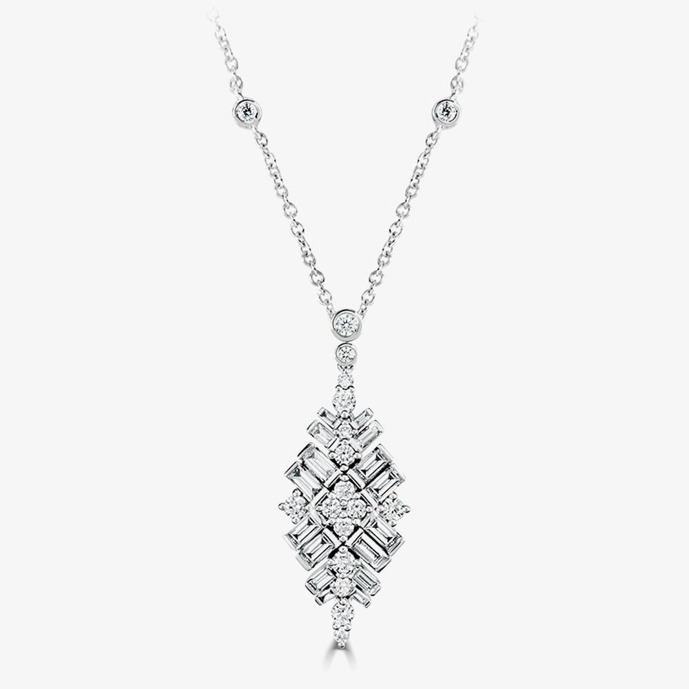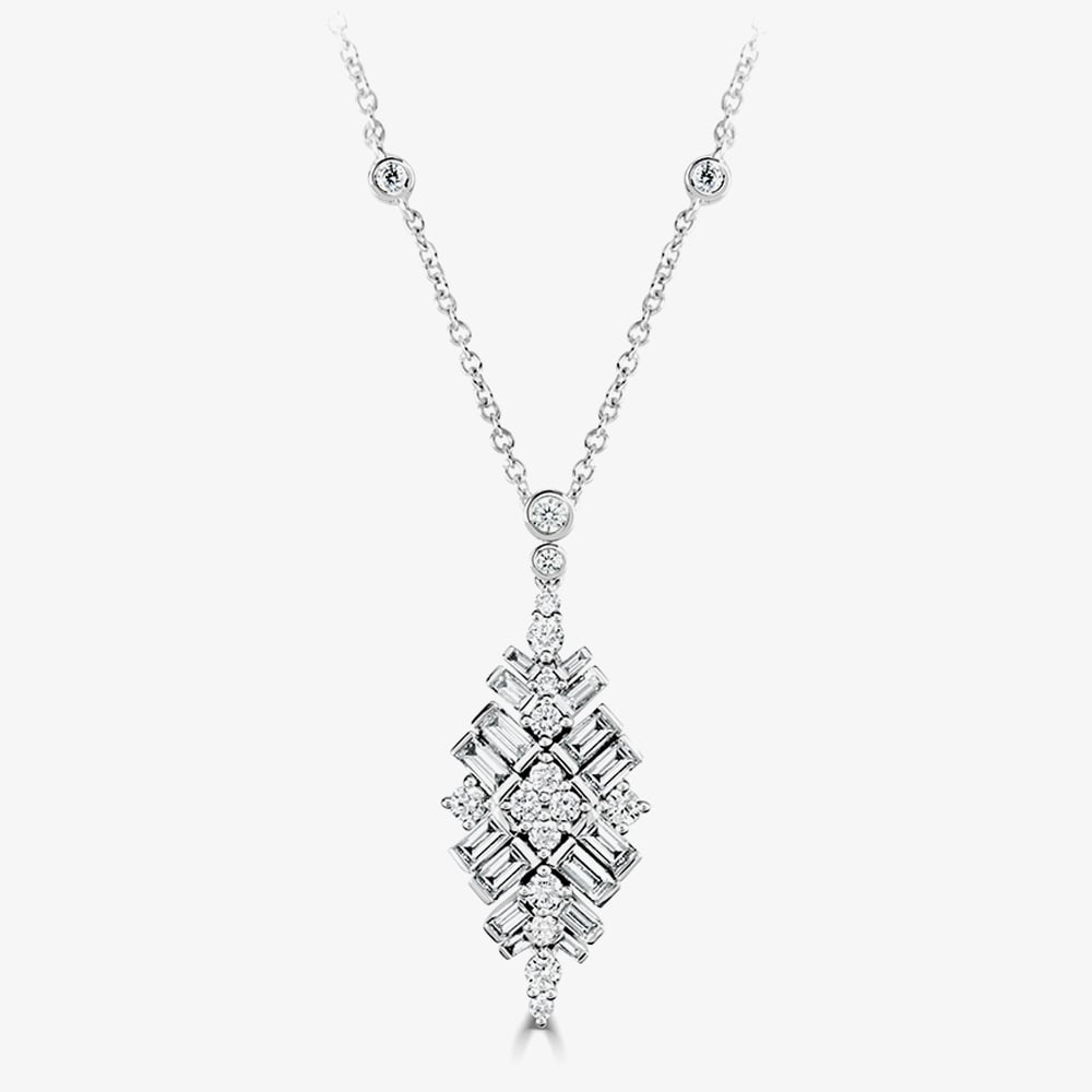 This statement fancy drop pendant is crafted in 18ct white gold & features 1.82ct of rubover & claw set baguette & brilliant cut diamonds which catch the light beautifully. A contemporary & stylish necklace to add a touch of sparkle to any outfit.