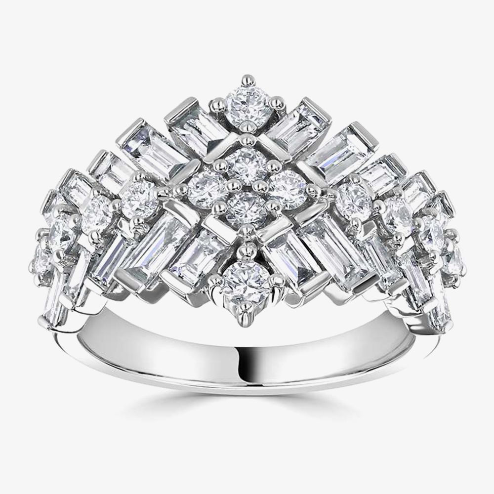 Offering show-stopping sparkle, the 18ct White Gold 1.83ct Diamond Cluster Ring LG201/RA is sure to bring glitz and glamour to any look. Made from 18ct white gold this stunning cluster ring features 1.83ct of round brilliant-cut and baguette-cut diamonds in claw and bar settings, arranged in a stunning retro-style cluster to give elegant style to anyone who wears it.