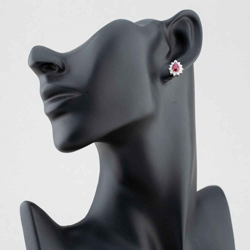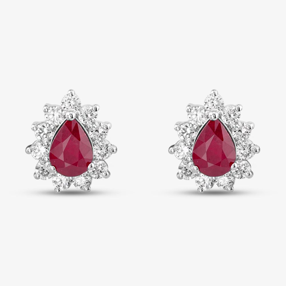 A luxurious pair of 18ct white gold stud earrings featuring a captivating pear cut ruby on each earring with a total of 1.83ct. Each ruby is surrounded by a shimmering cluster of 0.92ct brilliant cut diamonds, adding the perfect luxury touch to any outfit.