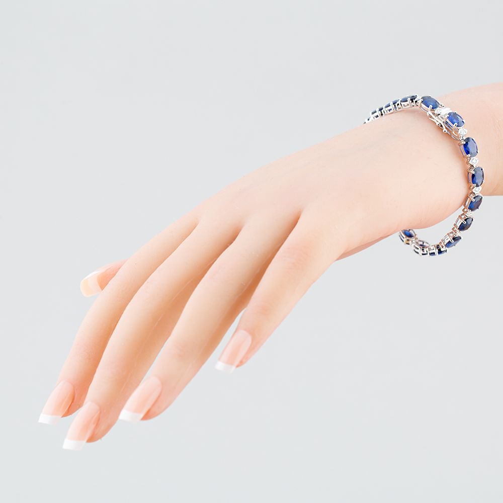 This 18ct White Gold Tennis Bracelet measuring 7 inches showcases luxurious 17.96ct oval cut sapphires surrounded by 4.8ct brilliant cut diamonds. The deep royal blue of the sapphires makes this item the perfect centerpiece for any jewellery collection. Set in gleaming white gold, this bracelet effortlessly combines classic charm with modern refinement.
