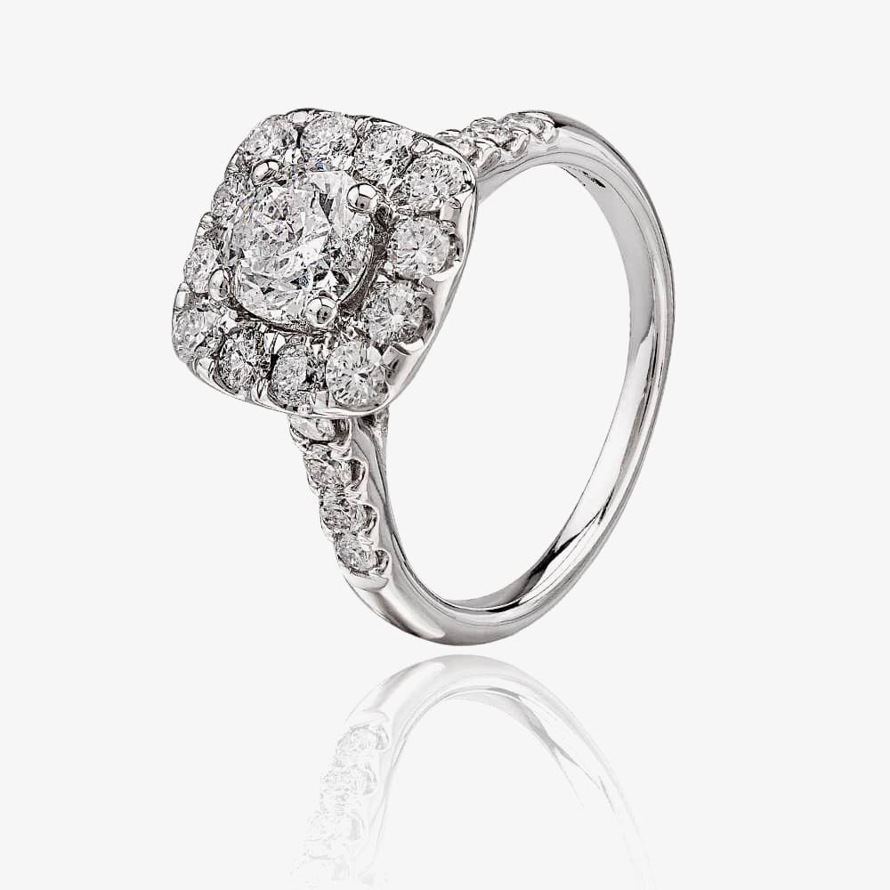 An 18 carat white gold cushion shaped cluster ring set with 2.00 carats of diamonds. It features a larger diamond set in four claws in the centre framed with smaller diamonds which also continue onto the shoulders of the ring.